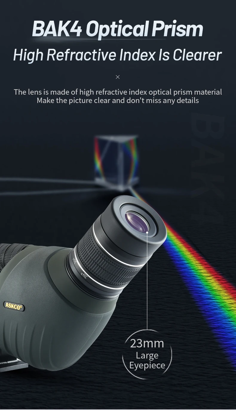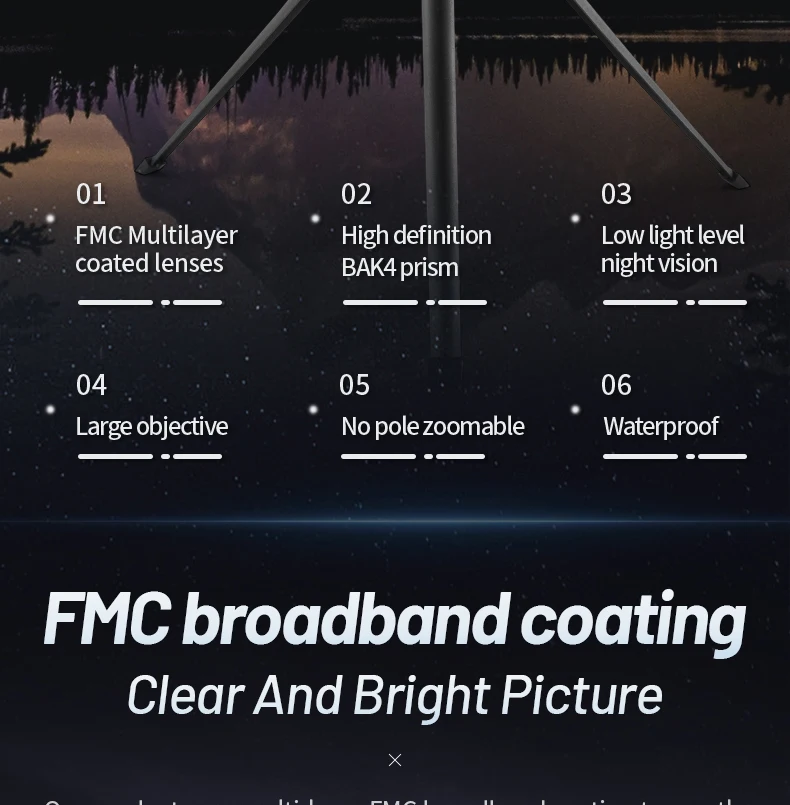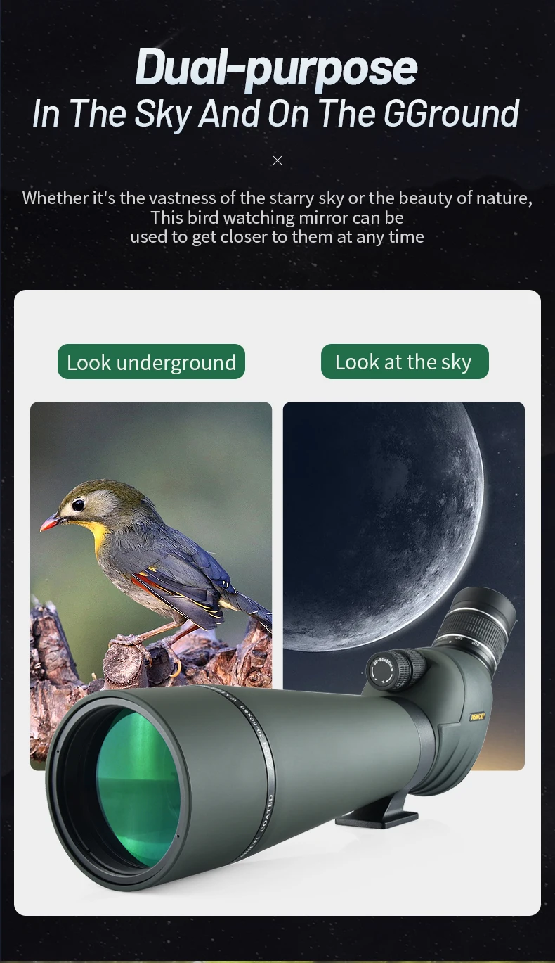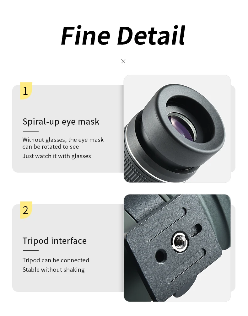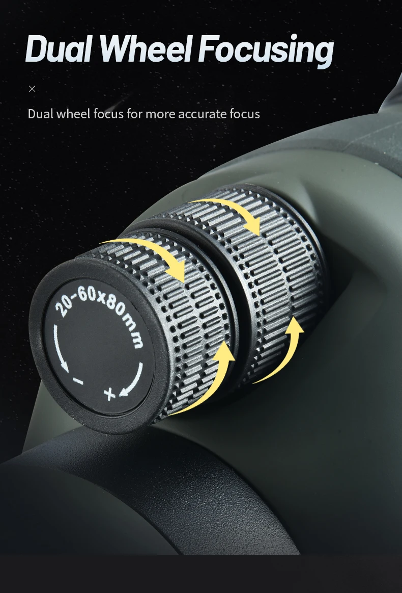 El aumento variable de 20x a 60x y el sistema de enfoque dinámico de la lente hacen que sea fácil acercarse.Perfecto para tiro con arco, observación de aves, observación de vida silvestre, caminatas, campamentos, paisajes, deportes al aire libre, observación astronómica, etc.