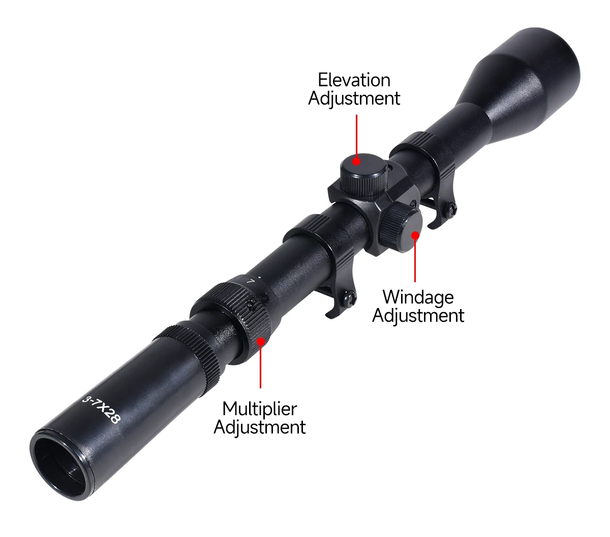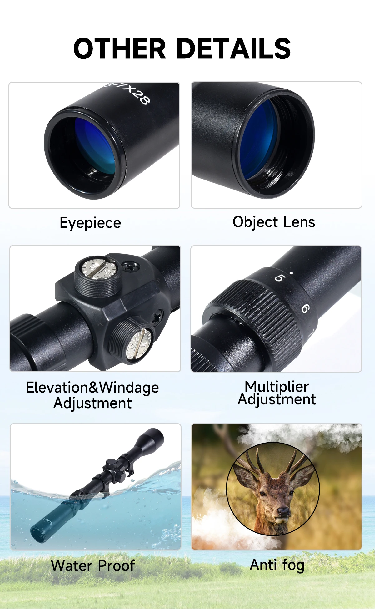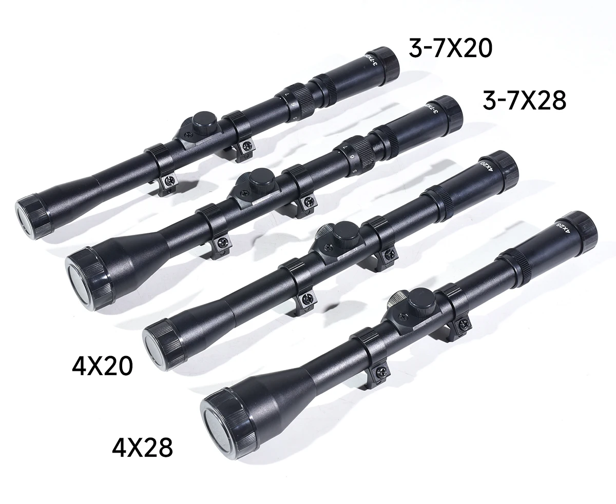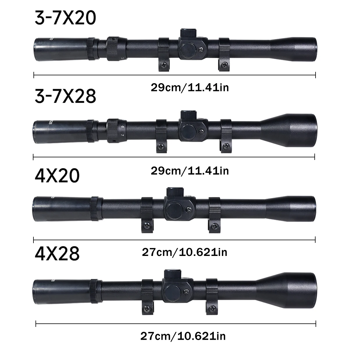 Alcance de rifle de caza, óptica de crosshair, 4x20/4x28/3-7x20/3-7x28, mira de caza, pistola de aire, alcance de rifle para riel de cola de milano de 11mm
