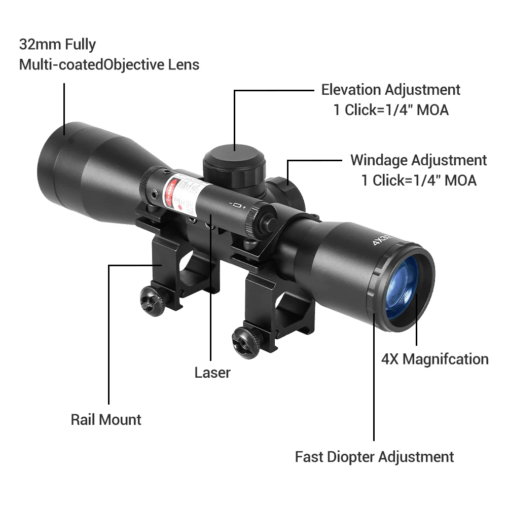 - Escopos de rifle de aire 4x32 con dioptrías de bloqueo, el largo alcance le brindan la máxima claridad. Valor de viento y elevación del clic: 1/4 MOA 1/4" a 100 yardas.