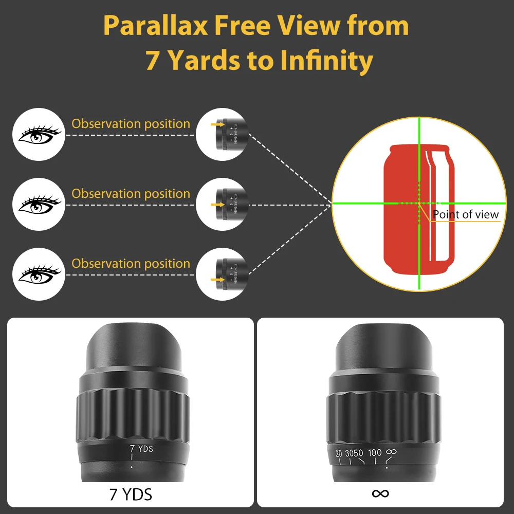 Retícula de telémetro con 5 niveles de iluminación en color verde y rojo, ocular de enfoque rápido ajustable de dioptrías para personas con vista diferente.