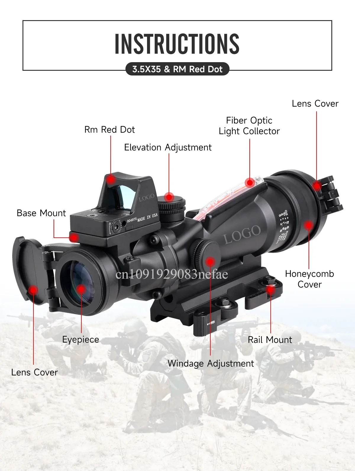 ILUMINACIÓN SIN BATERÍA: Cuenta con un retícula iluminado con tritio/fibra óptica que ajusta automáticamente el brillo según la luz disponibleCARCASA DE ALEACIÓN DE ALUMINIO RESISTENTE: La carcasa de aleación de aluminio para aviones 7075-T6 forjada proporciona un sistema de observación casi indestructibleDISEÑO DE “APERTOS EN AMBOS OJOS”: El A*OG se puede utilizar como mira CQB al disparar "Ambos ojos abiertos", utilizando el Concepto de puntería Bindon.Alivio ocular (pulgadas): 2,39, pupila de salida (mm): 10COMBAT PROPORTO: Ninguna otra óptica ampliada se ha utilizado más en combate que el A*OGRETICULO DE COMPLENAMIENTO Y RENDIMIENTO DE CARRETAS DE BORLETA: El retícula de alcance Crosshair rojo permite una compensación de caída de bala a 1.200 metros para.308Ampliación 3,5xLente objetivo 35 mmAlivio ocular 2,4 pulgadas.Campo de visión (grados) 5,5Campo de visión de 28,9 pies a 100 yardasAjustes (por pulgada a 100 yardas) 3 clicsFuente de iluminación Fibra óptica y tritio