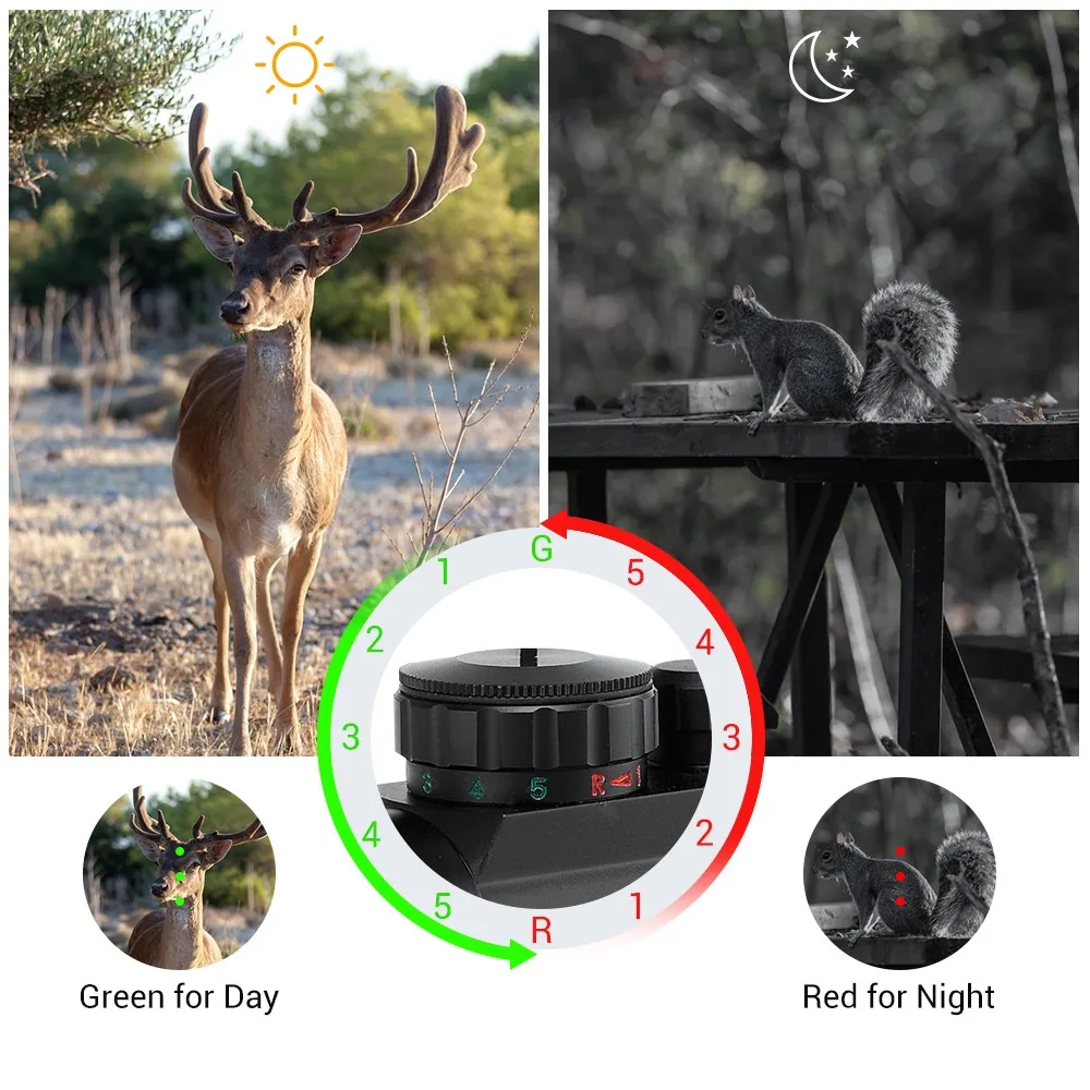 【 3,5 MOA Red Dot 】-La mira de punto rojo tiene 3,5 MOA 3 puntos con 1/4 MOA Ajuste de clic y un Reóstato que permite el control del brillo.