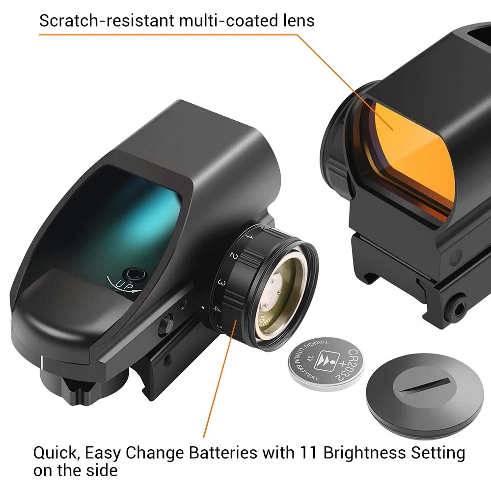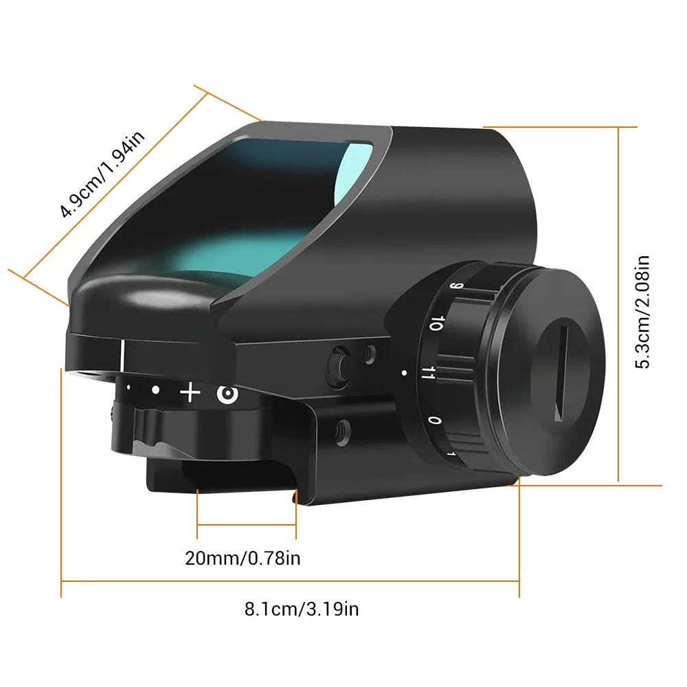 3. 【Antirreflectante 】La lente de mira de Pistola tiene un recubrimiento antirreflectante, que puede reducir en gran medida el reflejo del exceso de luz. Revestimiento de lente a prueba de reflexión para usar eficazmente en el sol. 11 ajustes de iluminación (8 luz diurna más 3 NV) para visibilidad en todas las condiciones de luz.
