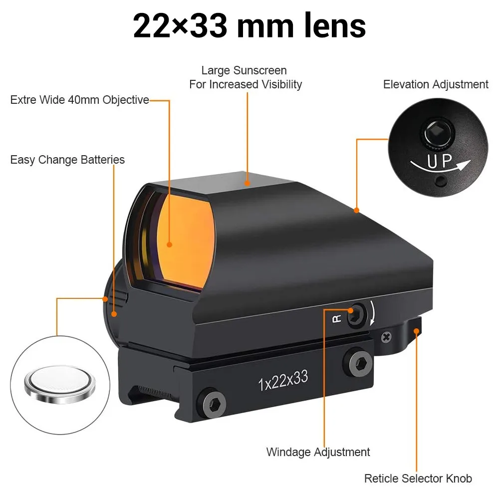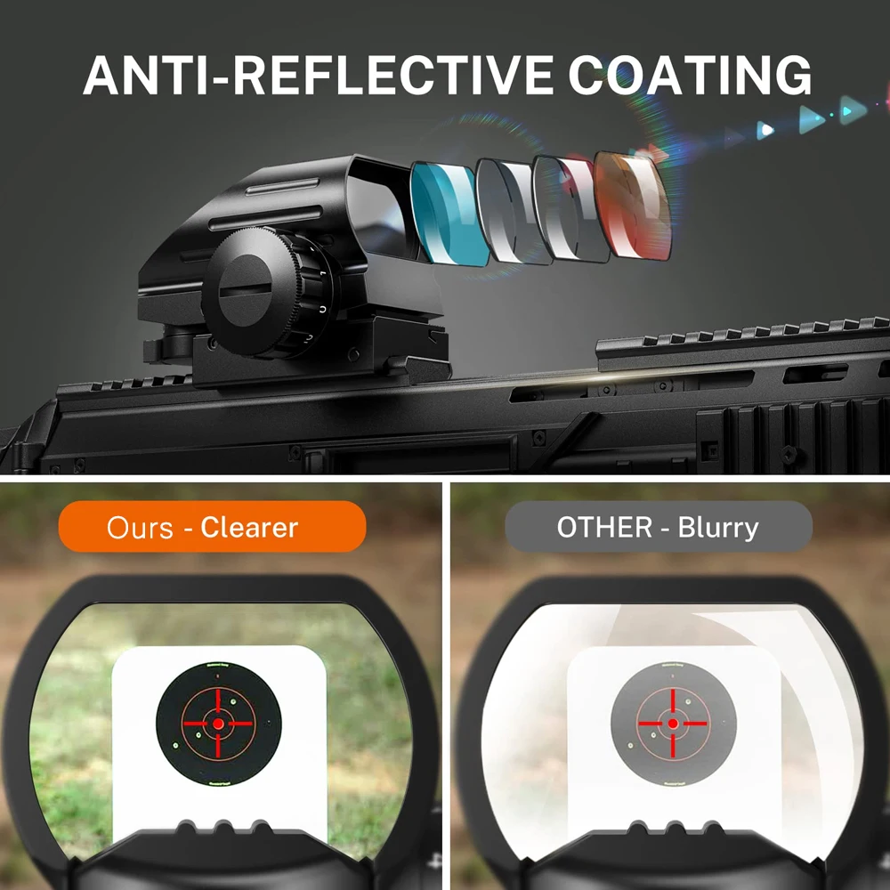1. 【Campo amplio】 La mira refleja tiene una apertura de lente de 33mm que proporciona un amplio campo de visión, adecuado para disparos rápidos o disparos de objetivos en movimiento además del disparo normal.