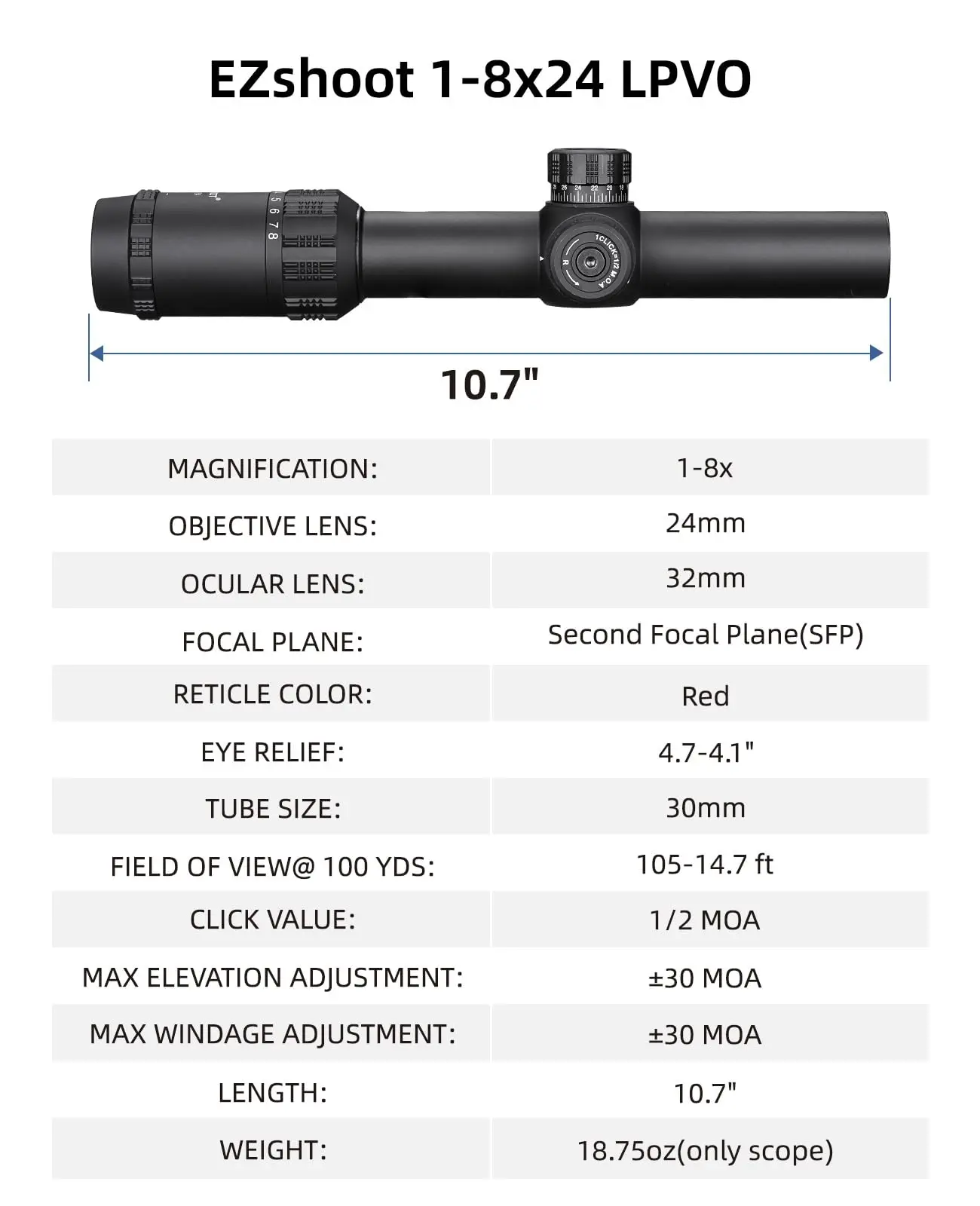 【Óptica de alta claridad】- La óptica HD y las lentes totalmente multicapa brindan una visibilidad detallada excepcional en cualquier condición de iluminación.Estas características de visor LPVO garantizan una claridad excepcional de borde a borde y un rendimiento superior con poca luz, brindando imágenes nítidas en todos los aumentos.