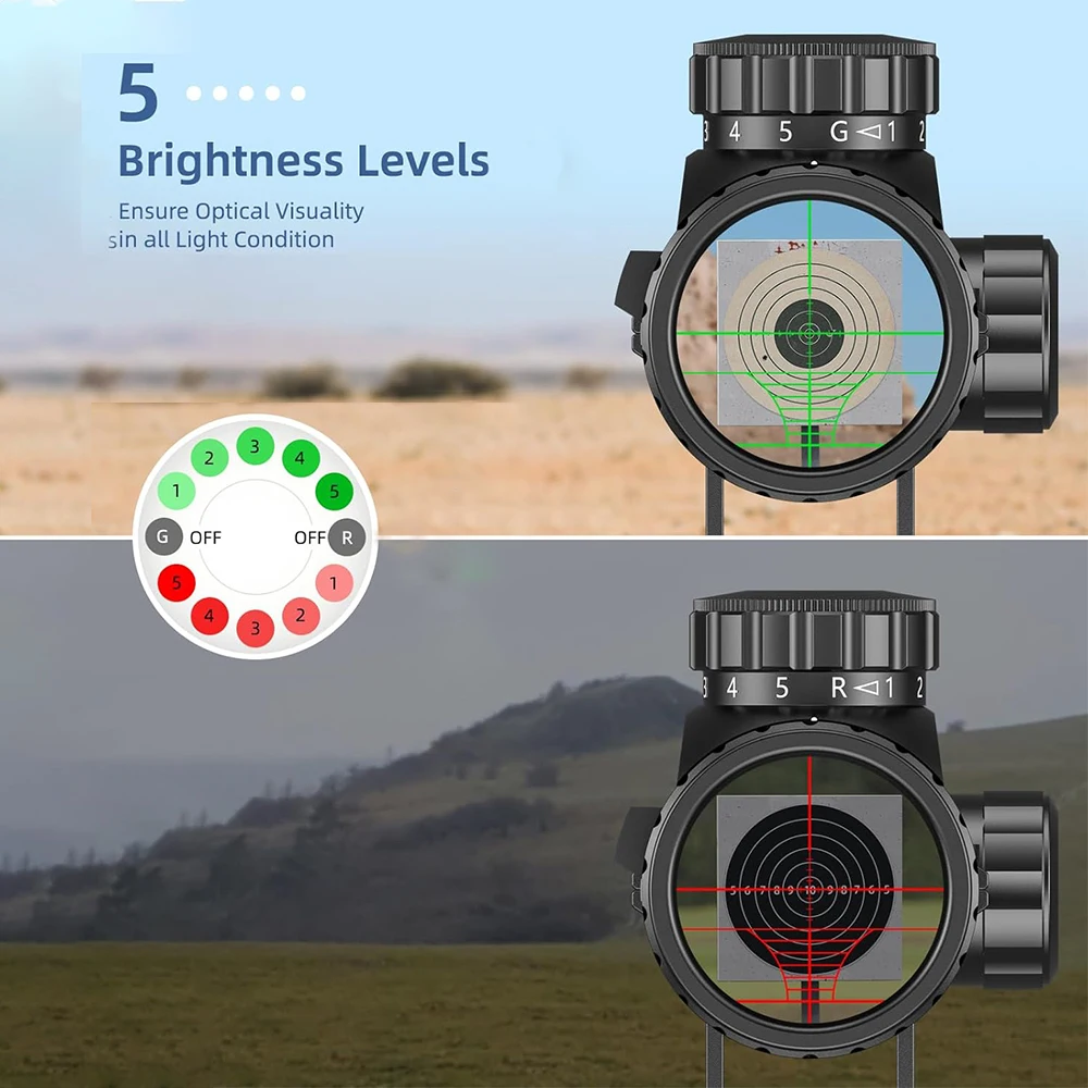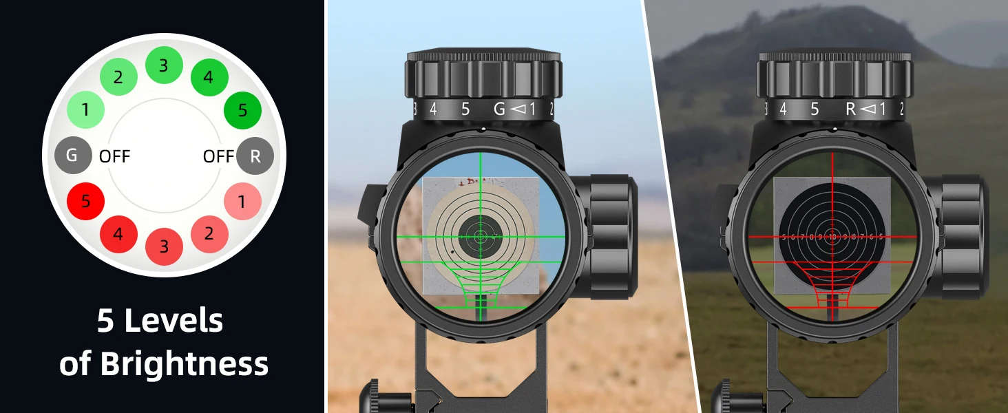 2.【Adjustable Illuminated Setting】Green and red illuminations, 5-level brightness available, allow the hunter to use normally in any light conditions.