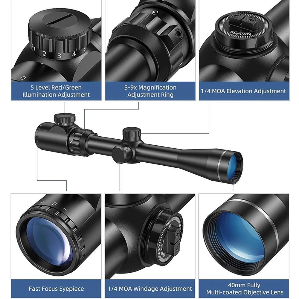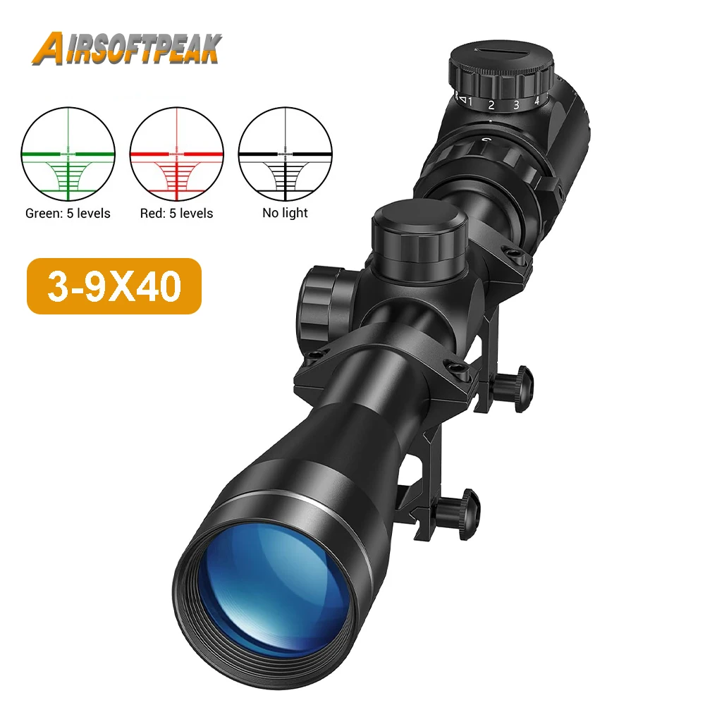 3-9x40 Rifle Scope Red Green Illuminated Rangefinder Reticle Riflescope Airsoft Hunting Gun Scope with 11/20mm Mounts