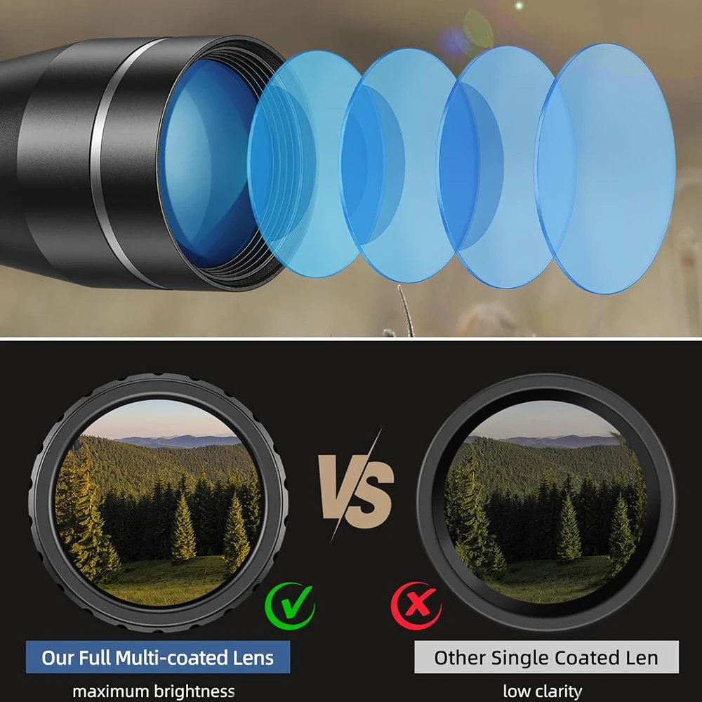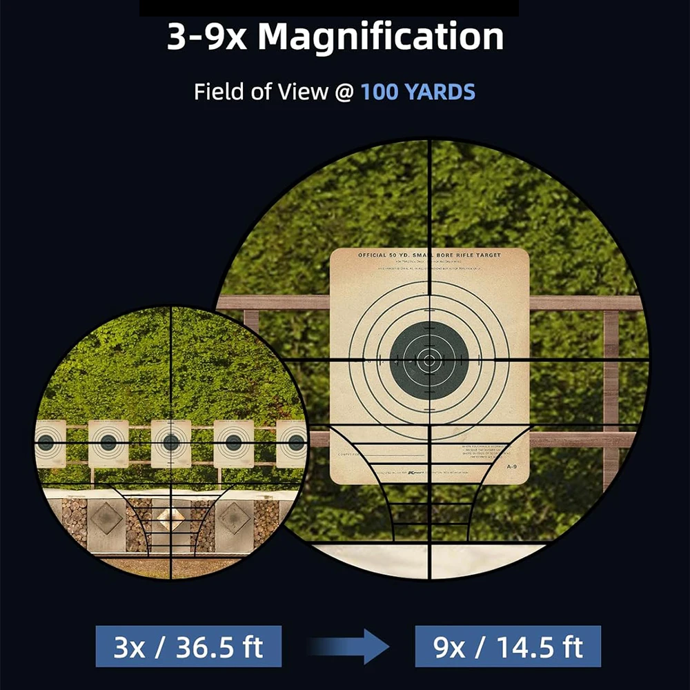 3.【Clearer View】Magnification: 3X to 9X. Objective lens: 40mm. Field of view: 25-14@100yds. Equipped with the multi-layer coated lens, the 3-9x40 scope has 95% light transmittance, clearer than the single-coated lens.