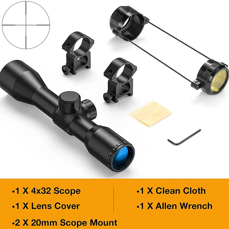 - Telescopios de airsoft con óptica cruzada, lentes de objeto de aumento de 4x, 32 mm con lentes multicapa de rendimiento HD, equipados con un ocular superior, los telescopios de rifle de largo alcance le brindan la máxima claridad y un ocular superior garantizado.