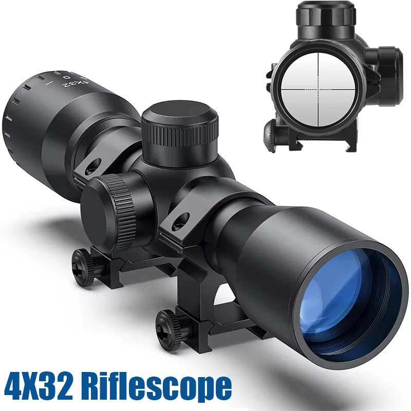 - Telescopios de airsoft con óptica cruzada, lentes de objeto de aumento de 4x, 32 mm con lentes multicapa de rendimiento HD, equipados con un ocular superior, los telescopios de rifle de largo alcance le brindan la máxima claridad y un ocular superior garantizado.