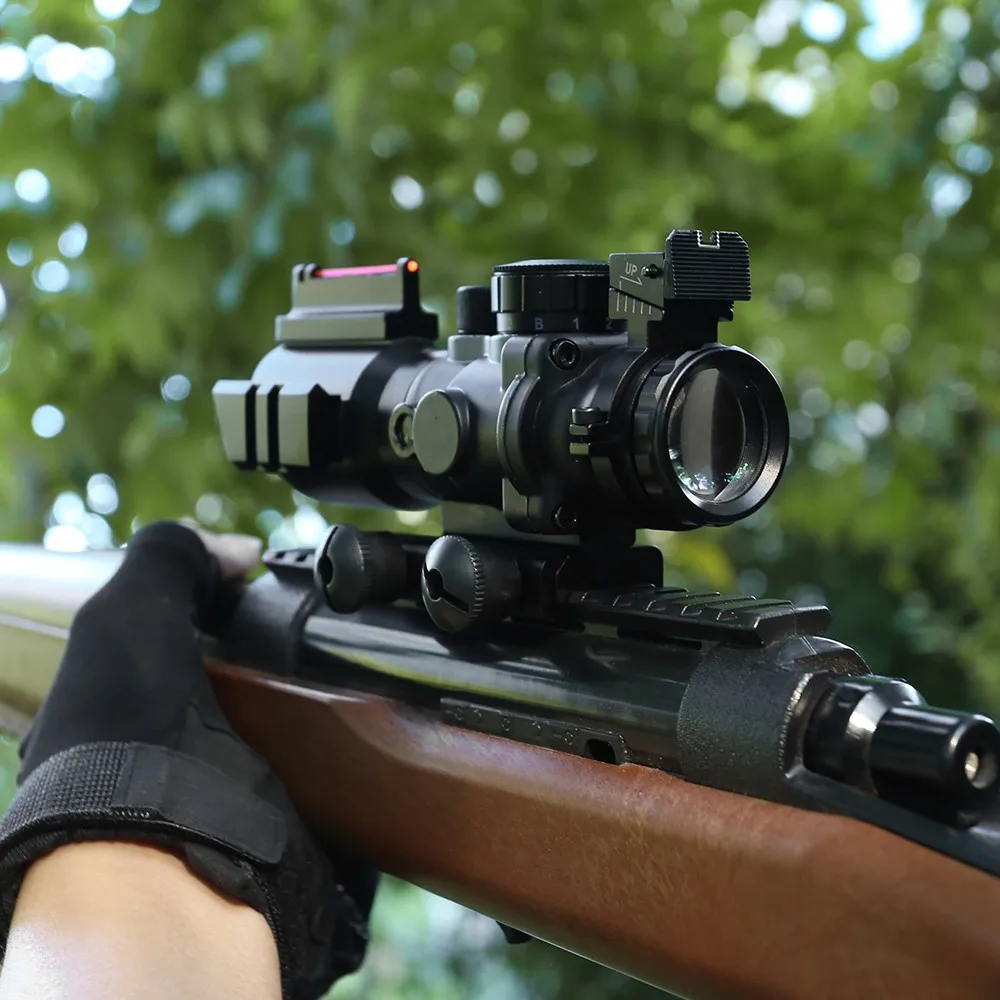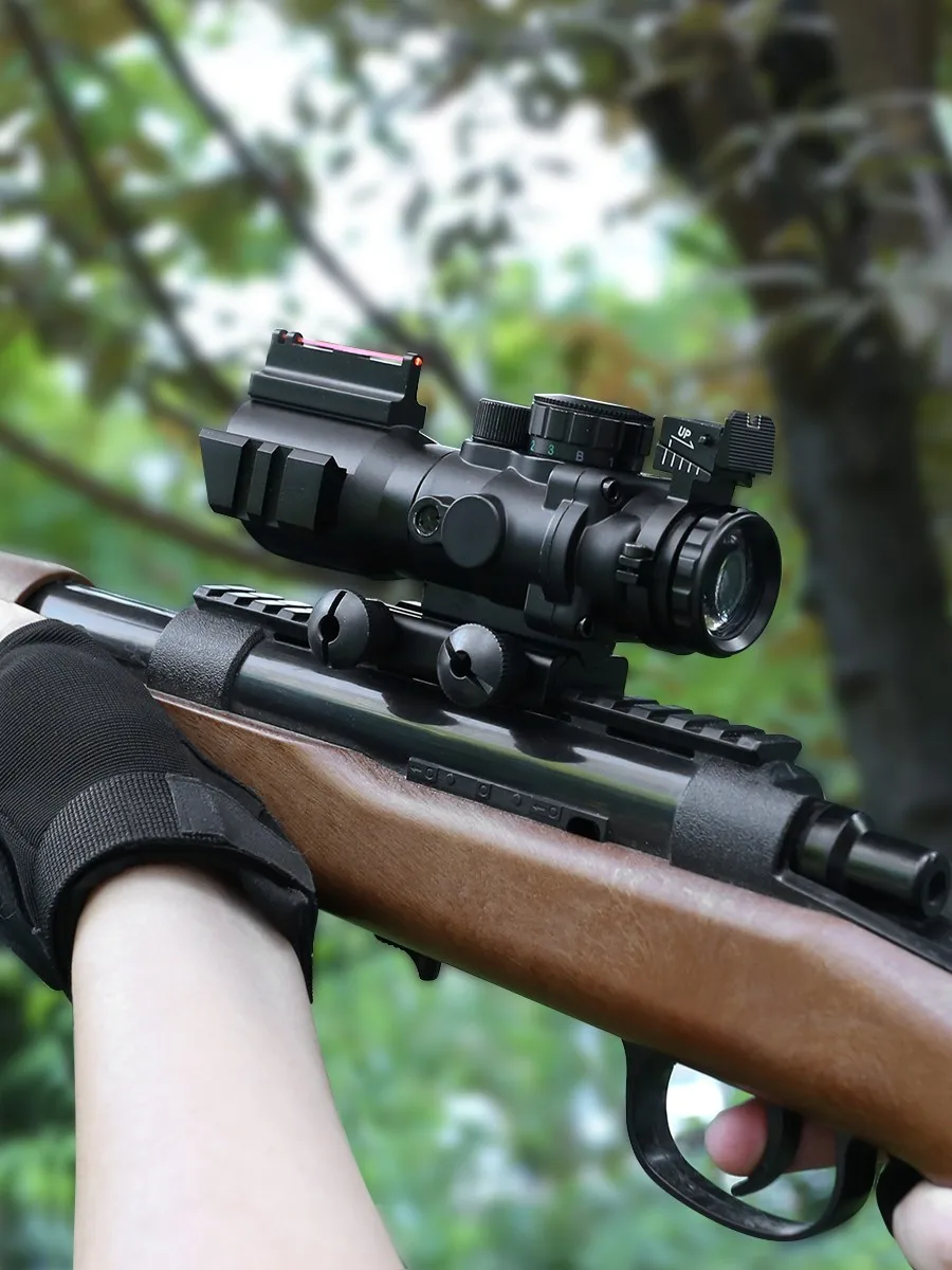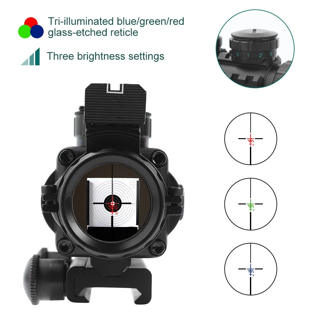 3. 【Reticulo iluminado】 Alcance de rifle de retícula rojo/verde/azul, 3 niveles de ajuste de brillo para todos los entornos, permiten al disparador utilizar el visor de retícula normalmente en cualquier condición de luz.
