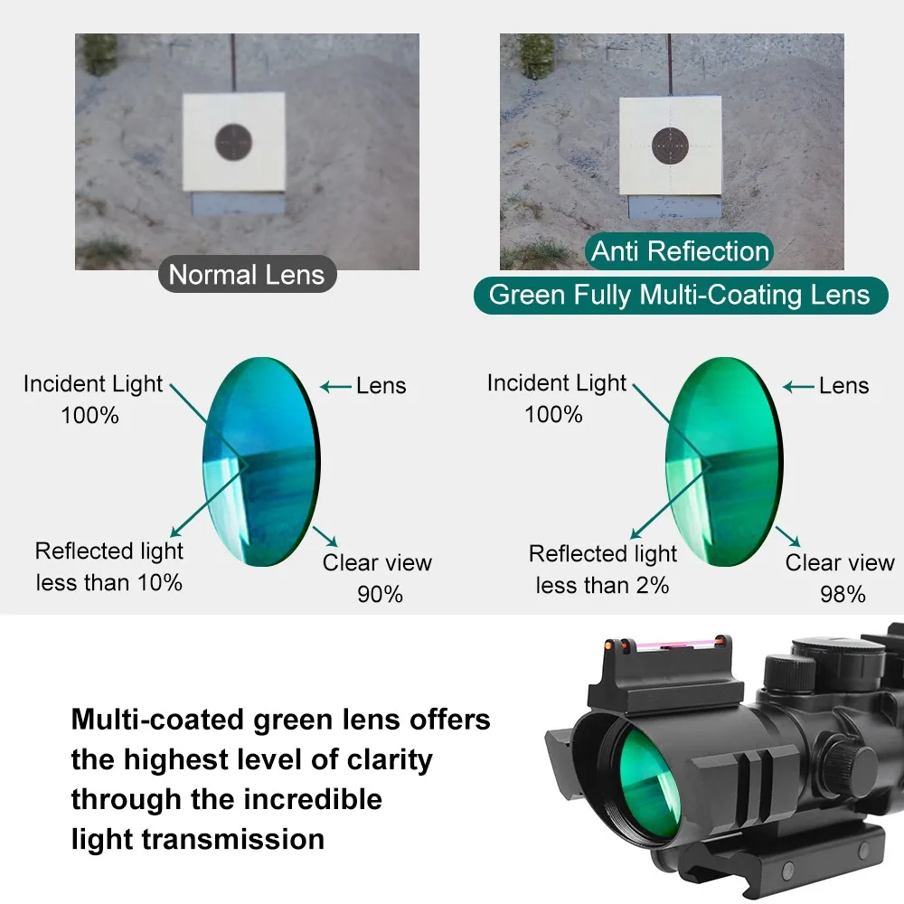2. 【Vista más clara】 Ampliación: 4x, lente objetivo: 32 mm.Campo de visión (pies/100 yardas): 36,6.Con las lentes verdes con revestimiento multicapa, el visor prisma cuenta con una increíble transmisión de luz del 95%, mucho más clara que la con lentes azules.