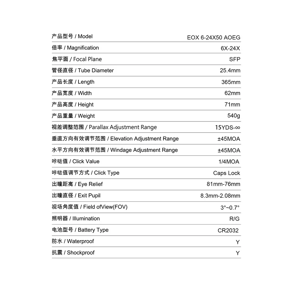 Modelo: EOX 6-24X50 AOEGAumento: 6X-24XAvión focal: SFPDiámetro del tubo: 25,4 mmLongitud: 365 mmAncho: 62 mmAltura: 71 mmPeso: 540 gRango de ajuste de parallax: 15YDS-00Rango de ajuste de elevación: ±45MOARango de ajuste del viento: +45MOAHaga clicValor:1/4MOATipo de clic: Bloqueo de tapasAlivio ocular: 81 mm-76 mmPupila de salida: 8,3 mm-2,08 mmCampo de visión (FOV): 3°~0.70Iluminación: R/GTipo de batería: CR2032 (no incluida)