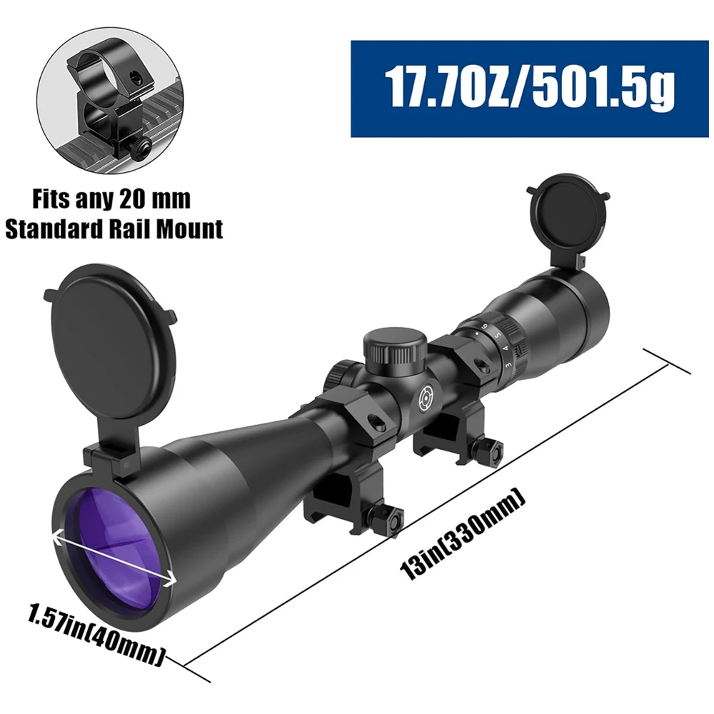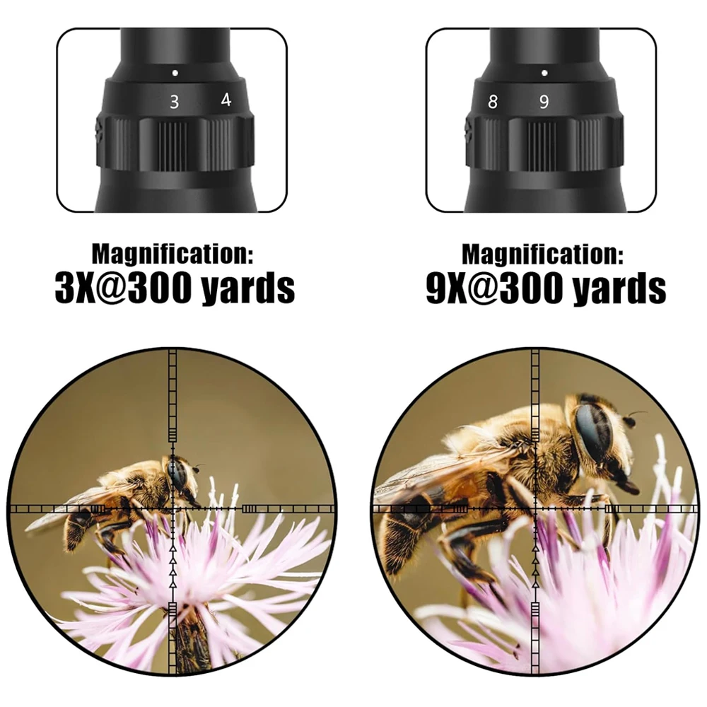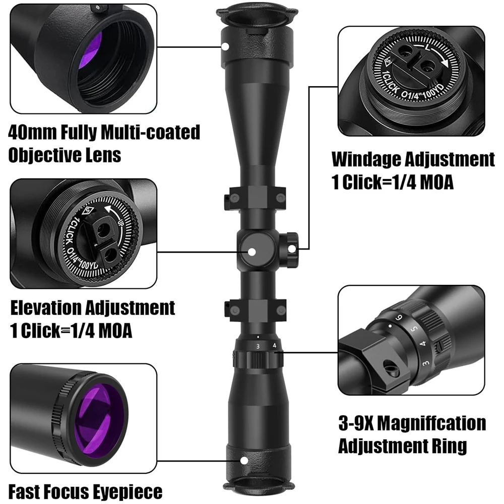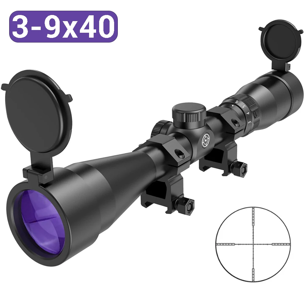 El visor del rifle 3-9x40 tiene un rango de aumento de 3-9x; longitud: 12,3" (312 mm); diámetro del objetivo: 40 mm; diámetro de la pupila de salida: 69,1 mm ~ 85,09 mm; campo de visión: 13,41-40,38@100 yardas; Valor del clic de devanado y elevación: 1/4 MOA 1/4"@100 yardas.El retícula iluminado del telémetro proporciona puntos de puntería rápidos y sencillos para diversas distancias de disparo.