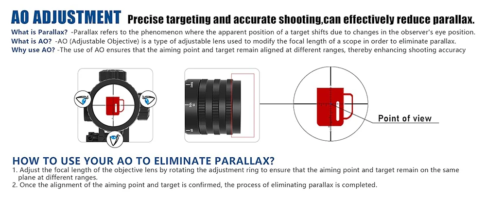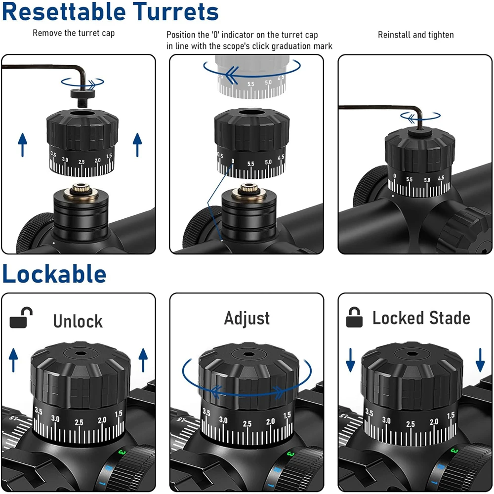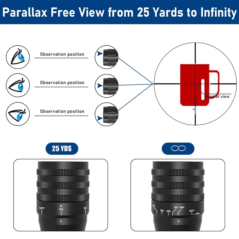 El visor del rifle cuenta con un objetivo ajustable para la corrección del paralaje y un ocular de enfoque rápido para garantizar la claridad y precisión de la retícula en diversas iluminaciones.Para obtener una nitidez óptima, apunte a un objeto distante, gire la perilla de enfoque completamente en sentido antihorario y luego ajuste el ocular hacia adentro hasta que el retícula esté claramente definido.