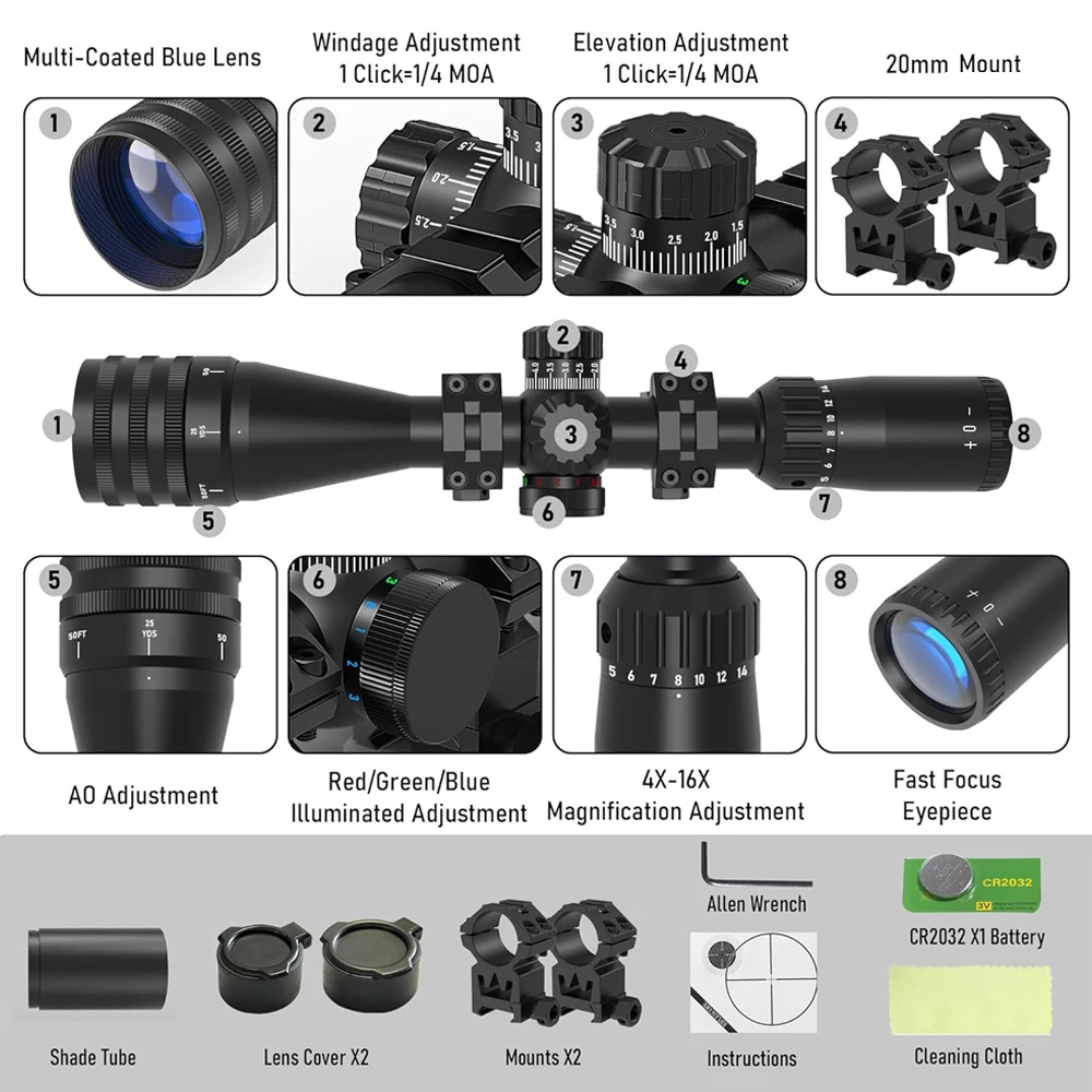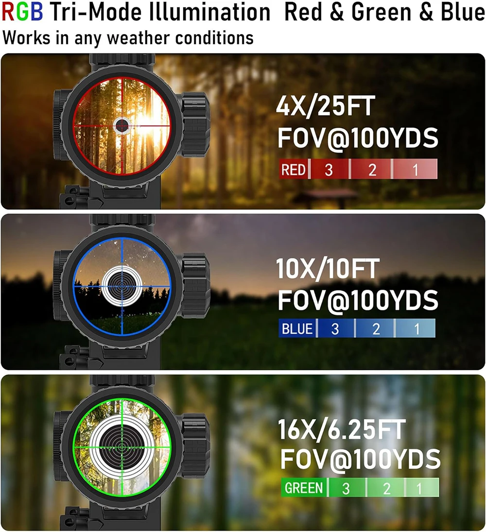 La mira telescópica 4-16x integra lentes HD totalmente multicapa para una claridad y fidelidad de color óptimas con una retícula de vidrio grabada.Cuenta con una retícula RGB Tri-Mode con iluminación roja, verde y azul independiente, cada uno que ofrece tres niveles de brillo para una claridad personalizable en diferentes condiciones de iluminación, lo que garantiza una visibilidad y precisión superiores.