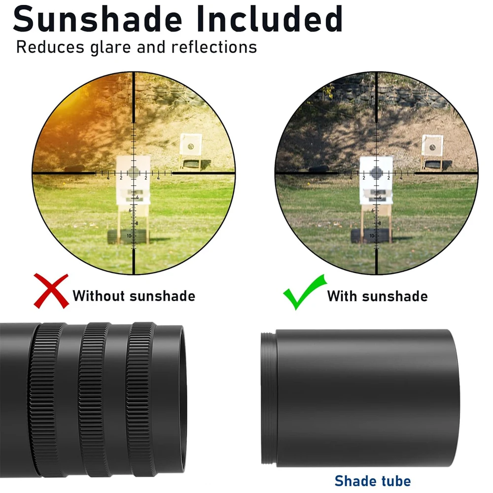 El visor de rifle 4-16X44AO cuenta con torretas de bloqueo expuestas y de ajuste rápido con reinicio cero para una calibración de elevación y deriva sin esfuerzo, lo que proporciona retroalimentación precisa, táctil y audible para una precisión de disparo dinámico.Un parasol reduce el deslumbramiento para mejorar la claridad visual, protege la lente contra los elementos ambientales y mejora la precisión del disparo en condiciones de iluminación brillante.