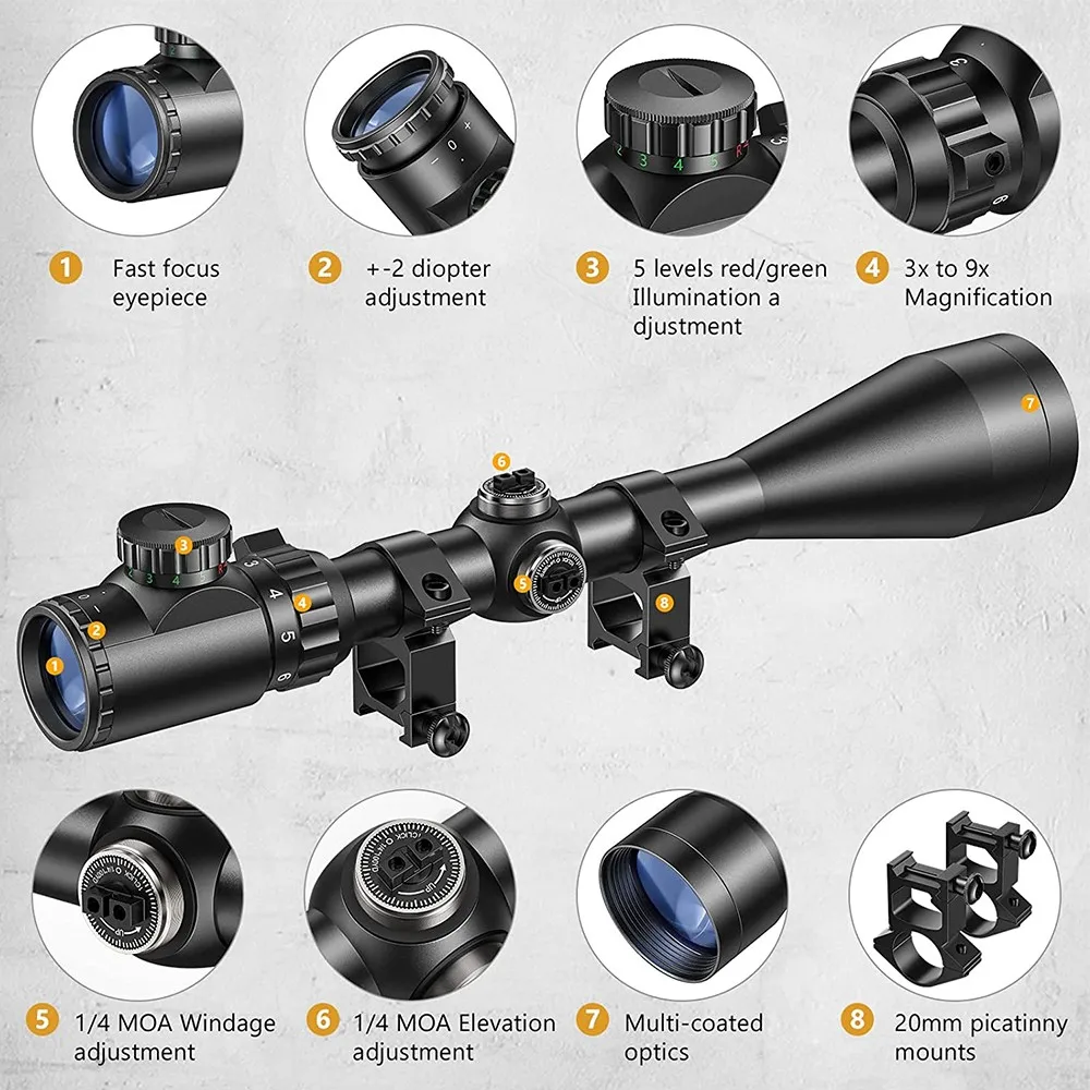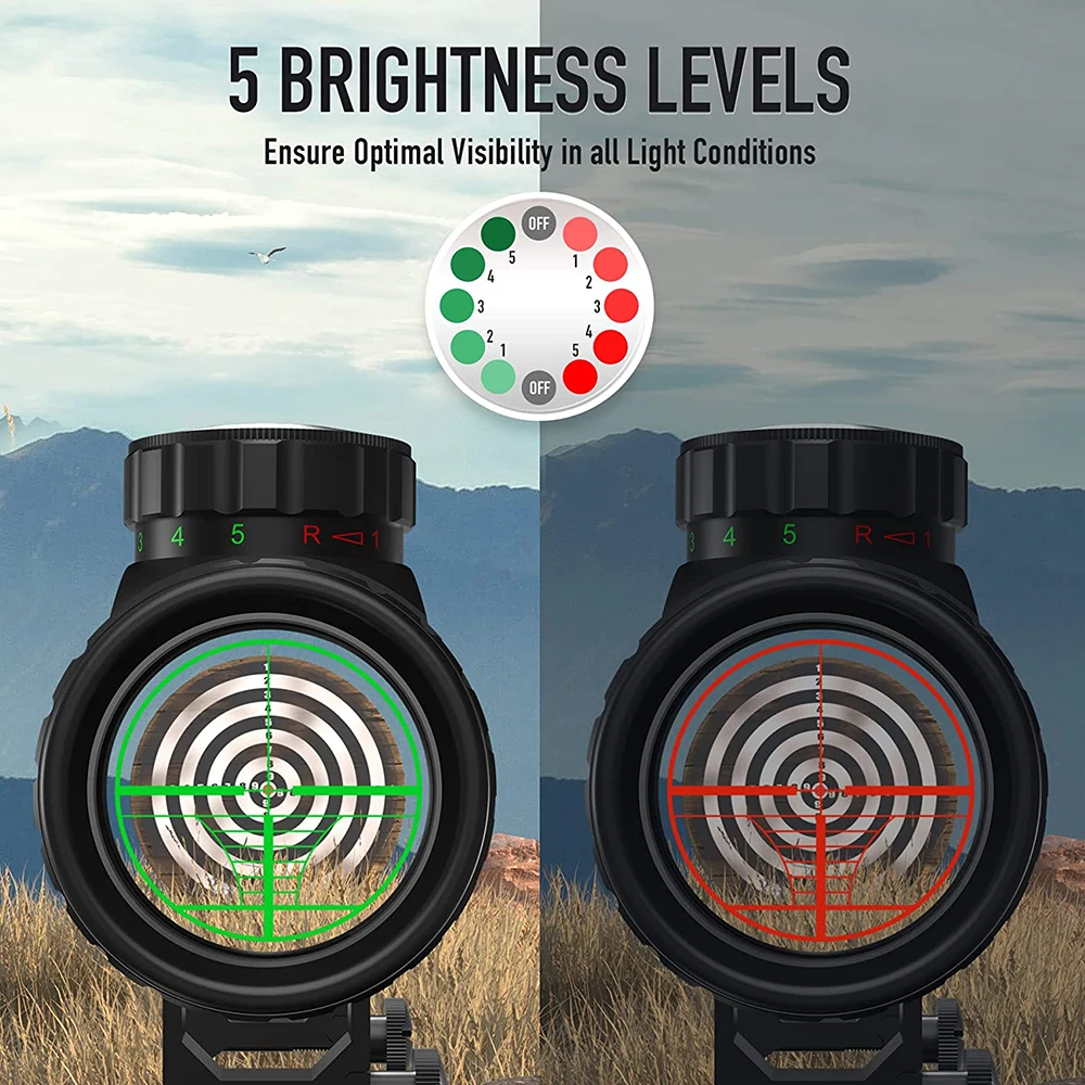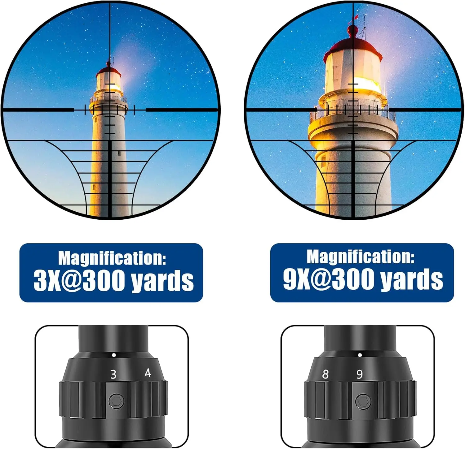 - Alcance del rifle con iluminaciones verdes y rojas, brillo disponible en 5 niveles, aumentos de 3X hasta 9X, lente de objeto de 40 mm con lentes multicapa de rendimiento HD, equipados con un ocular superior, los telescopios del rifle de largo alcance le brindan la máxima claridad y un ocular superior garantizado.