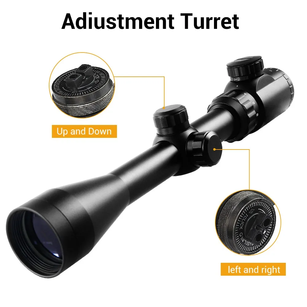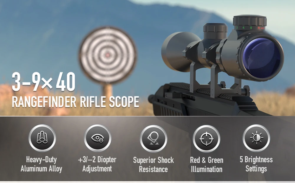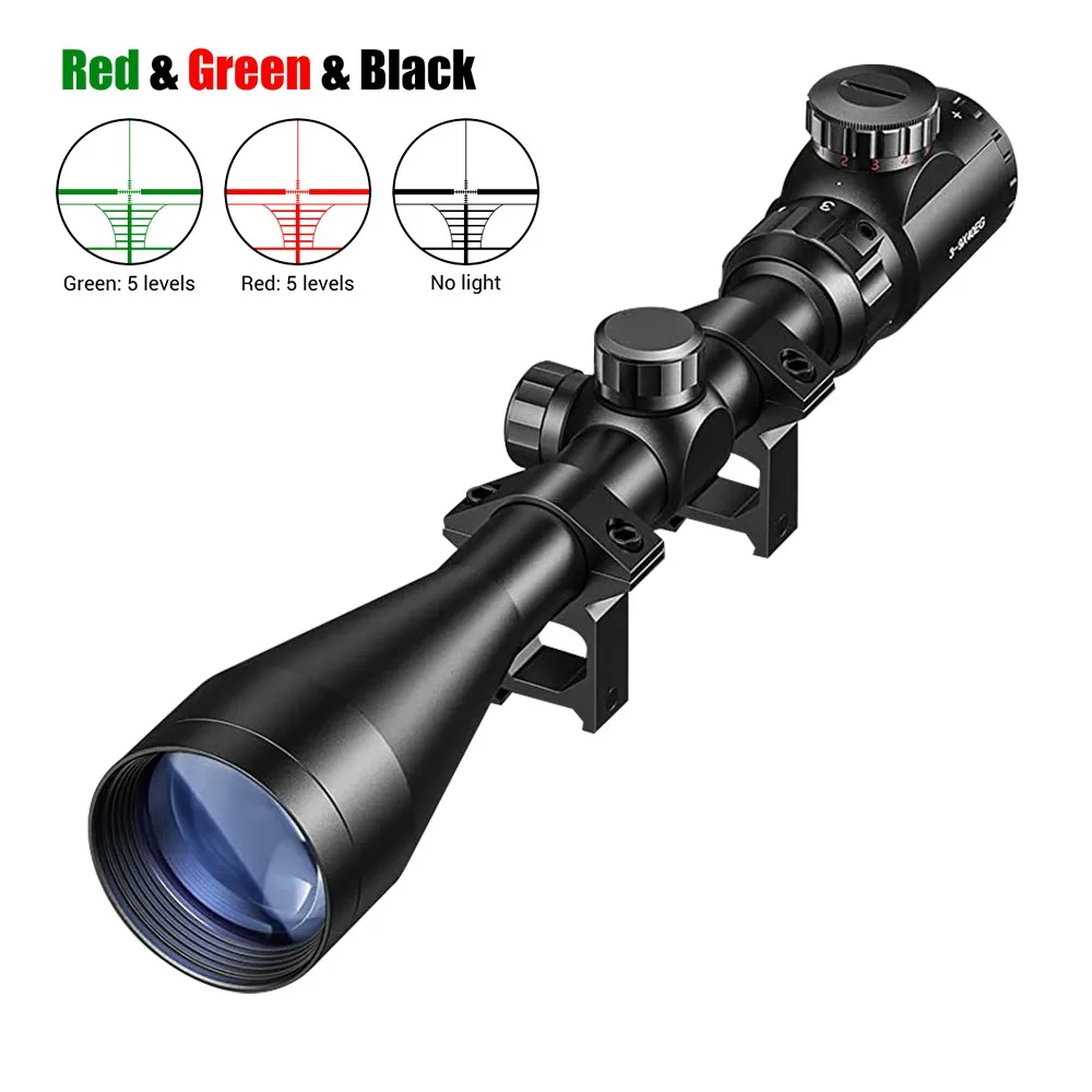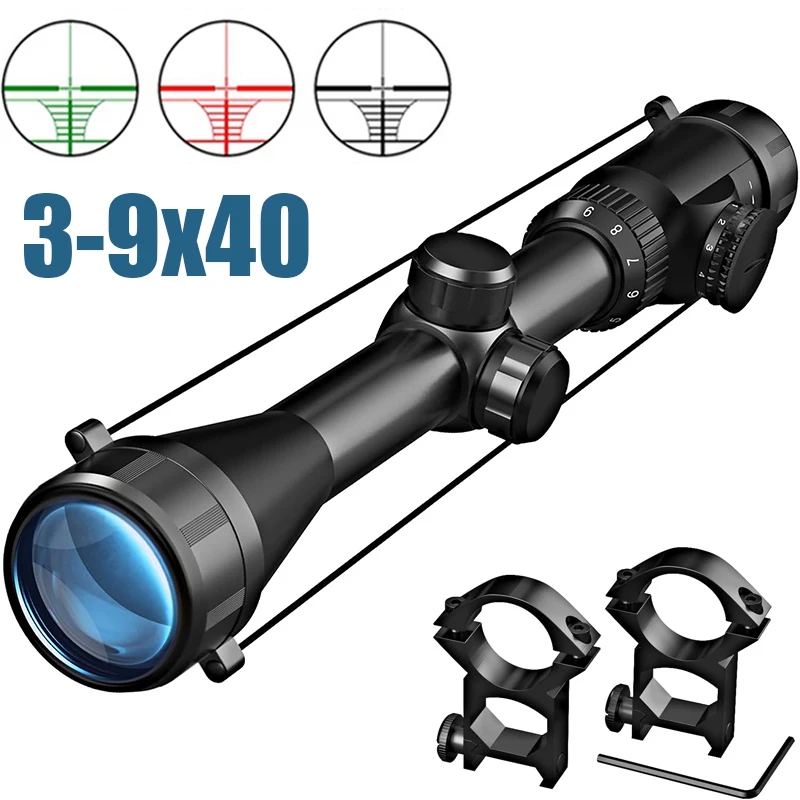 - Alcance del rifle con iluminaciones verdes y rojas, brillo disponible en 5 niveles, aumentos de 3X hasta 9X, lente de objeto de 40 mm con lentes multicapa de rendimiento HD, equipados con un ocular superior, los telescopios del rifle de largo alcance le brindan la máxima claridad y un ocular superior garantizado.