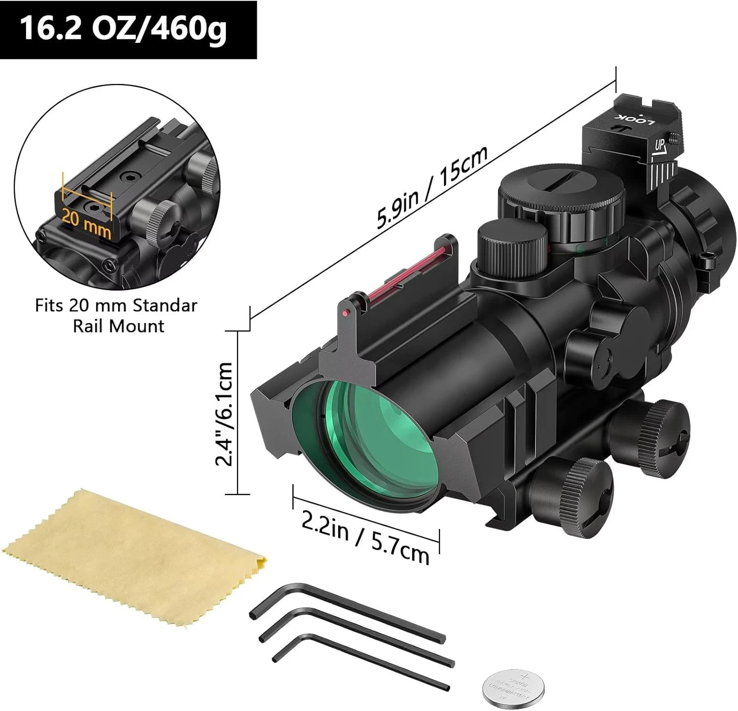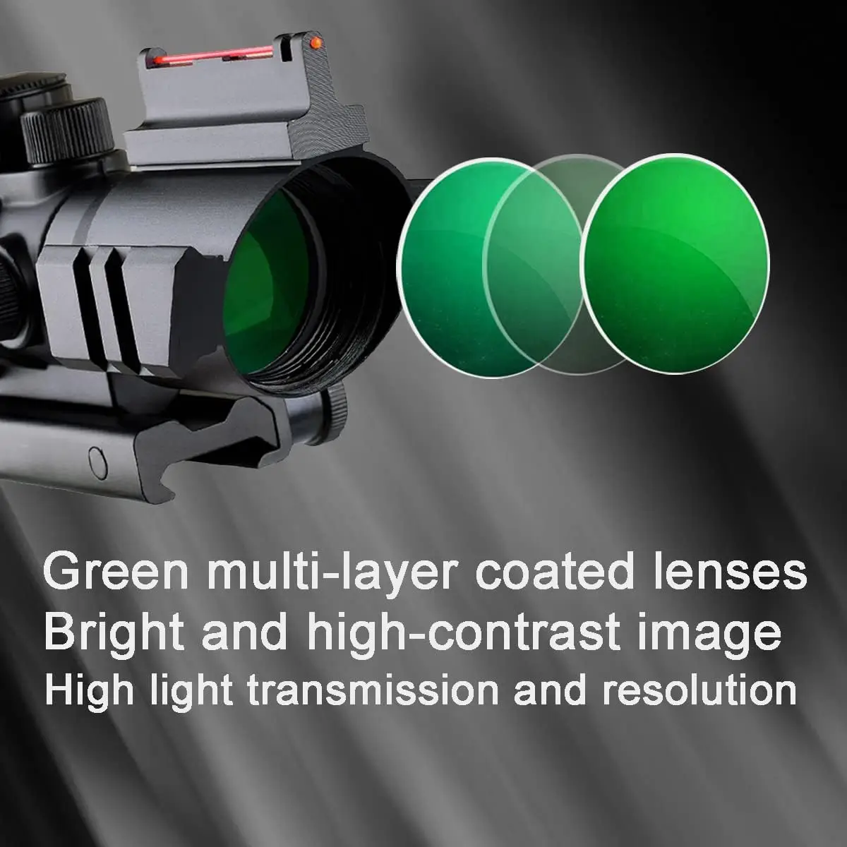 2. 【Vista más clara】 Ampliación: 4x, lente objetivo: 32 mm.Campo de visión (pies/100 yardas): 36,6.Con las lentes verdes con revestimiento multicapa, el visor prisma cuenta con una increíble transmisión de luz del 95%, mucho más clara que la con lentes azules.