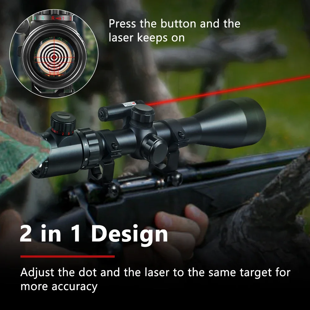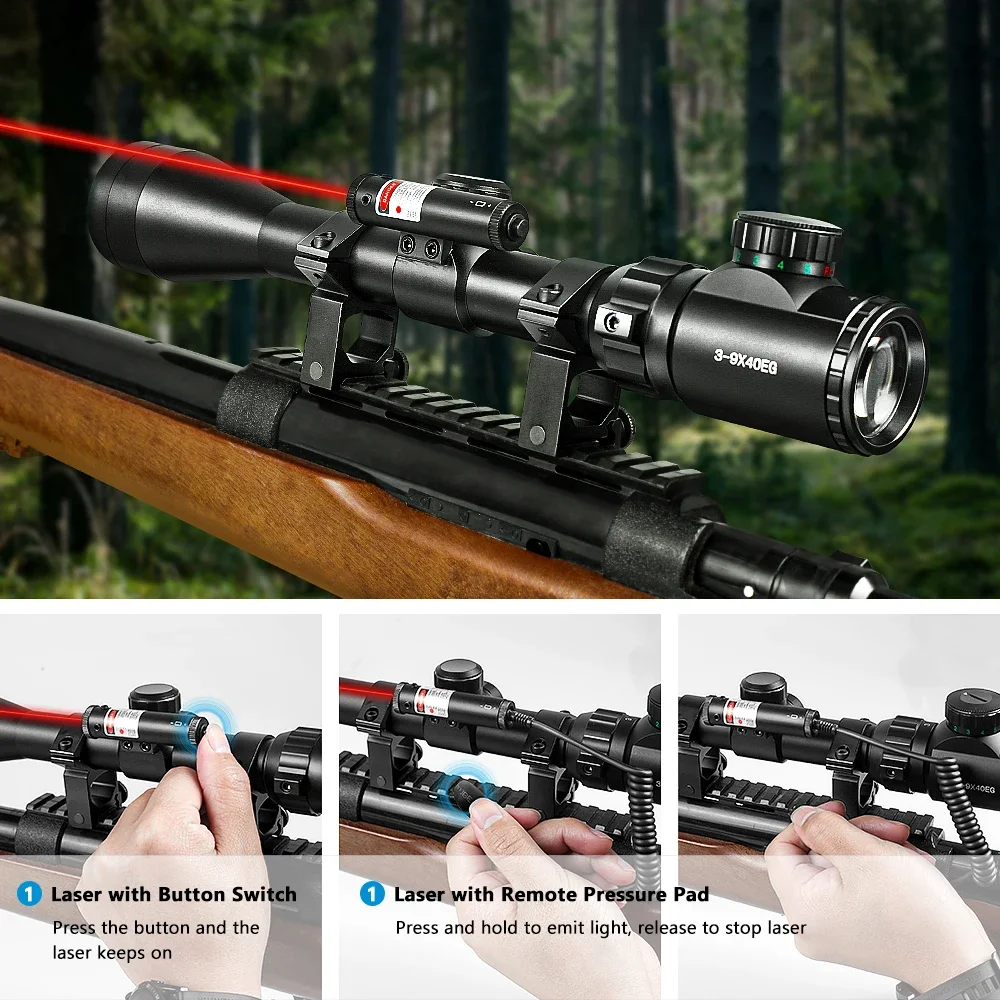 【Nuevo juego óptico de precisión 2 en 1 mejorado】El kit óptico proporciona a los tiradores una solución óptica integral, que incluye un visor de rifle 3-9x40 y una mira láser roja, láser Clase IIIA y potencia de salida inferior a 5 mW.El alcance de visión del láser es de 50 a 300 pies durante el día.La característica de esta nueva actualización es la combinación de láser rojo, que le brinda una experiencia de puntería más precisa y rápida.