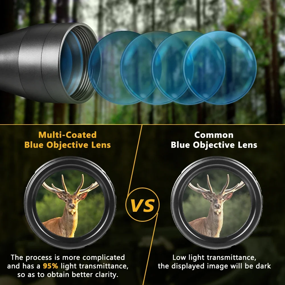 【Lentes totalmente multicapa】El visor del rifle está equipado con un sistema óptico totalmente recubierto de alto rendimiento, con revestimientos antirreflectantes en todas las superficies de vidrio para una transmisión de luz optimizada.El vidrio óptico totalmente multicapa ofrece una excelente transmisión de luz, lo que garantiza imágenes claras y nítidas con retículas precisas.