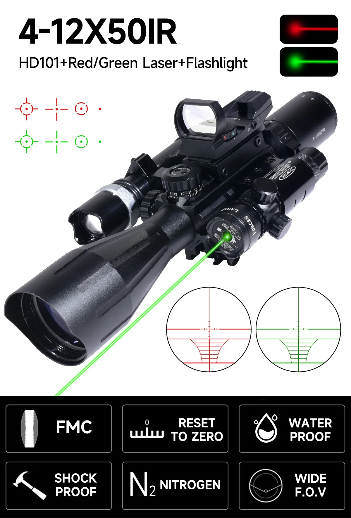 Lente de alta transparencia de luz y alta claridad óptica, el acabado negro mate de alta calidad lo hace más texturizado, el alcance lleno de nitrógeno seco hace que sea 100% impermeable, a prueba de golpes y a prueba de niebla.