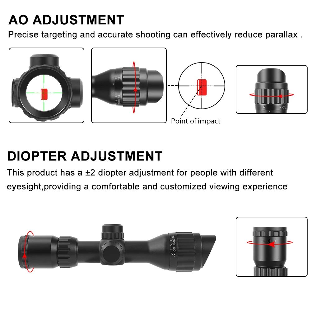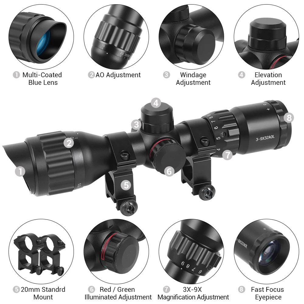 Ampliado de 3X a 9x para apuntar a 300 yardas y más. AO (objetivo ajustable) de 3 yardas a infinito proporciona una imagen de puntería más precisa. Diámetro del objetivo: 32mm, campo de visión: 13-38 @ 100yds, valor de clic: 1/4 MOA @ 100 yardas.
