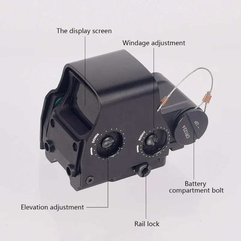 551 características: Función de seguridad eléctrica, apagado automático en 2 horas Fácil de configurar, se adapta a cualquier riel de 20mm. Ajuste de elevación y apalancamiento en el lado de la vista Color: negro Batería: 4 pilas LR44 No incluido Dimensiones: 10 cm (largo) x 5cm (ancho) x 6cm (alto) Sobre el peso: 390G A: Ajuste de brillo (hacia arriba) B: Ajuste de brillo (hacia abajo) C: Cambio de color de la retícula (rojo/verde)