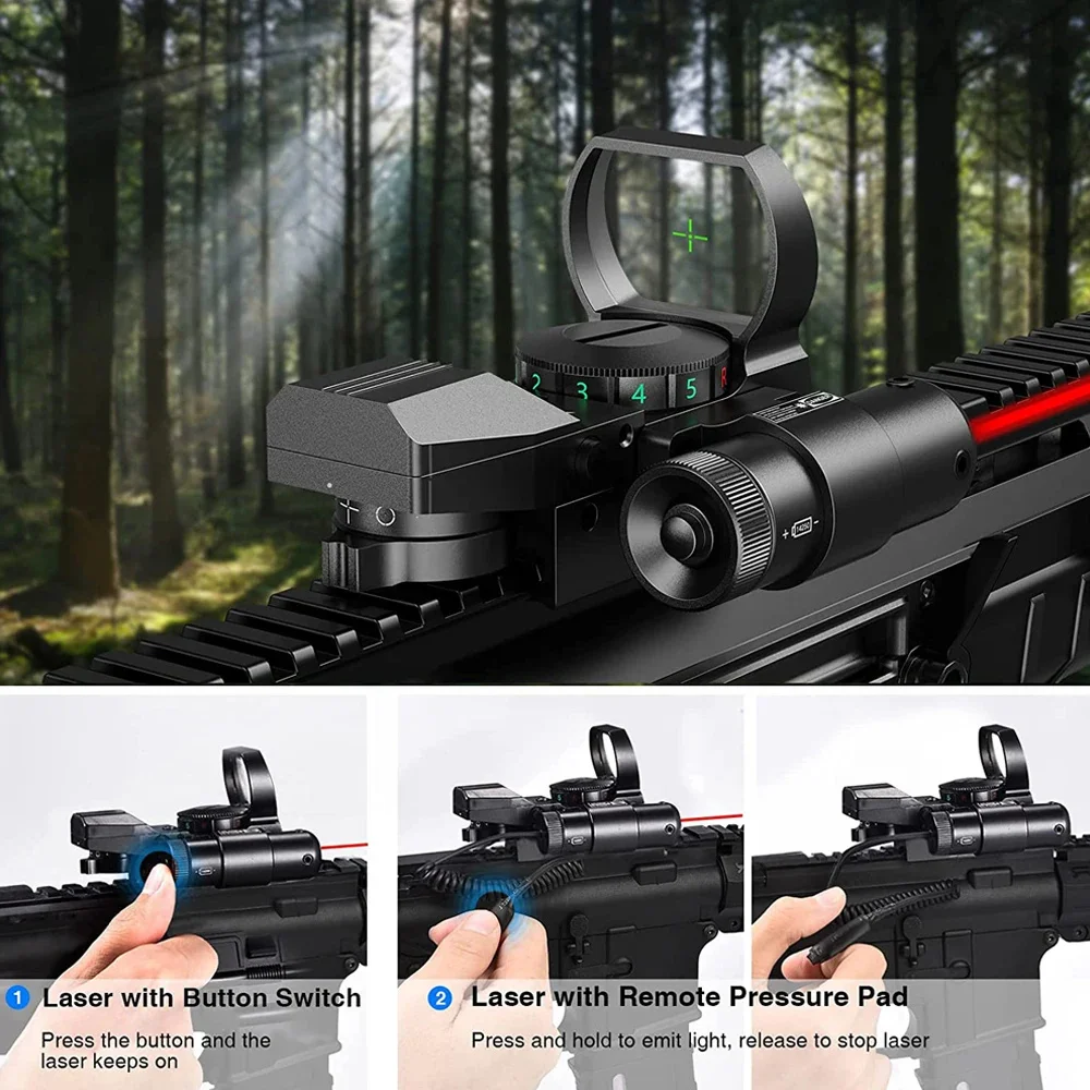 【Reflex Sight with Laser】Built with the red sight laser (Class of the laser: Class IIIA) and dual illuminated reflex sight with four reticle types. The pressure pad switch is convenient for the laser operation.