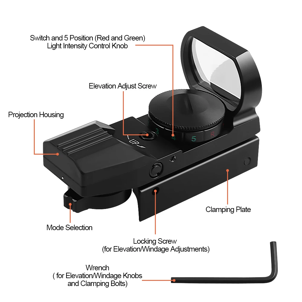 【 4 retículas Rojas/verdes (punto circular, Cruz, 10 MOA y 3 MOA) 】con cuatro patrones de retícula iluminados en rojo o verde, este visor para reflejos ofrece un total de 8 opciones diferentes de visualización y 5 niveles de brillo entre los que alternar.