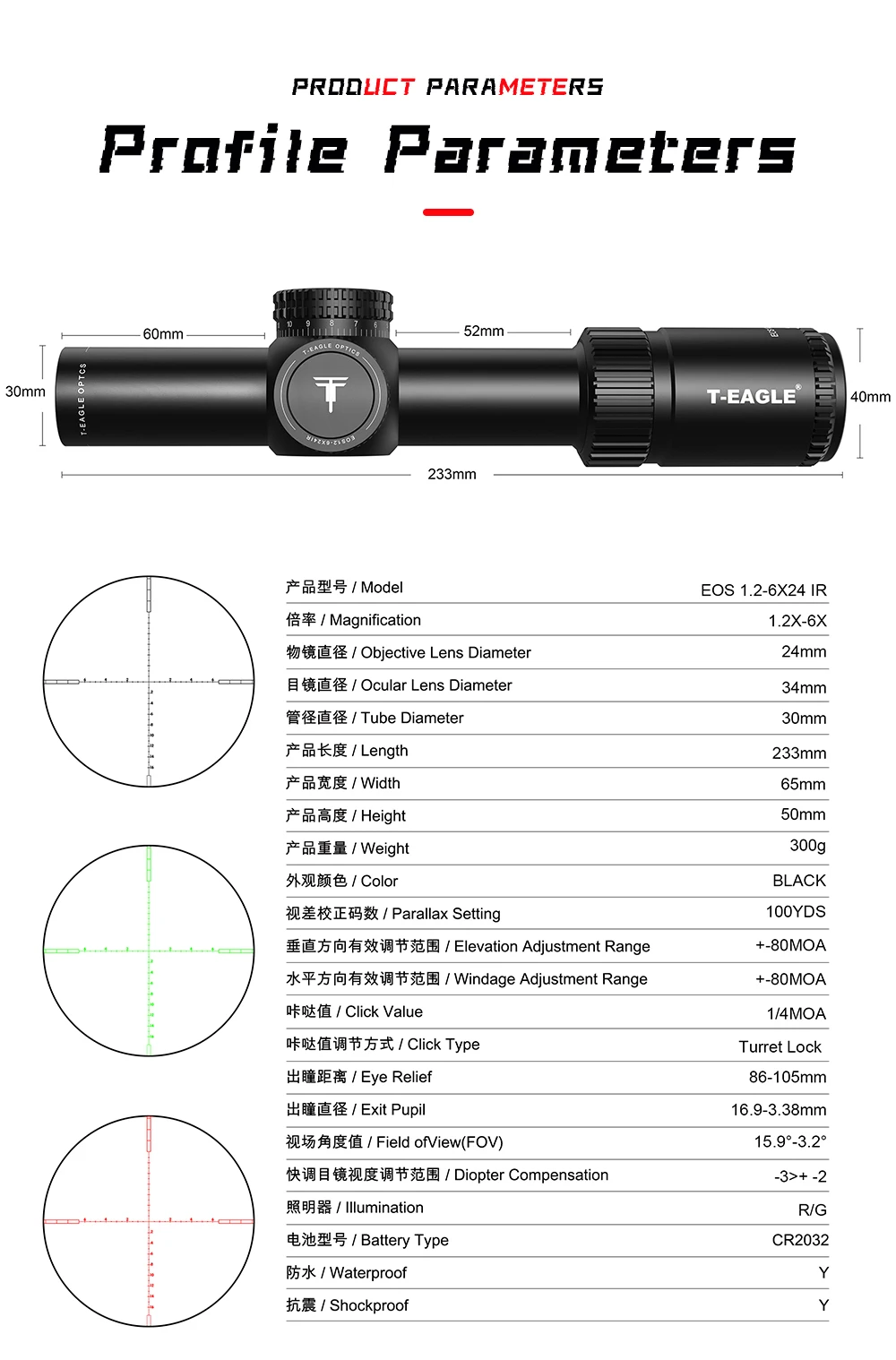 Mira telescópica táctica con soporte de alcance de 25mm, 1,2-6x24, telescopio de caza portátil IR al aire libre para pistola de aire, accesorios de caza y Paintball