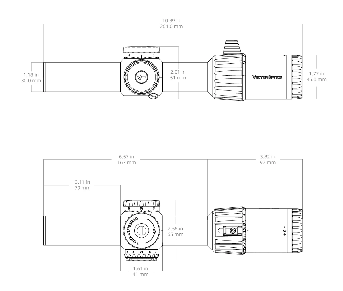 · El diámetro del tubo de 30 mm amplía el rango de elevación y deriva a 60 MIL, valor de clic de 1/10 MIL para un ajuste preciso