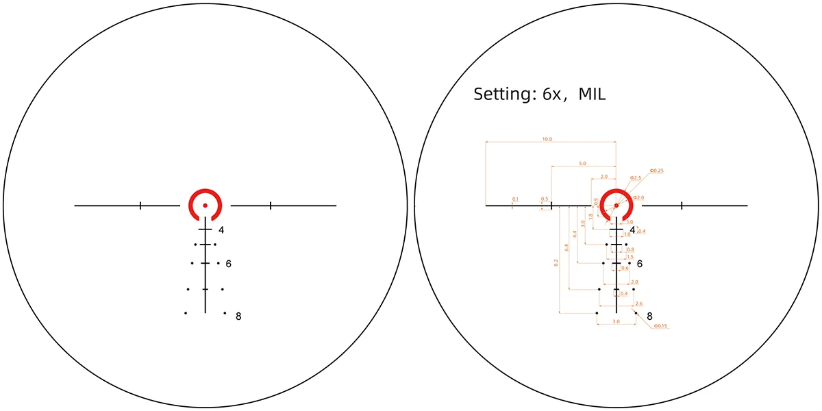 · Anillo central y retícula BDC para una rápida adquisición de objetivos, punto central de 0,25 MIL para apuntar con precisión dentro de 200 m