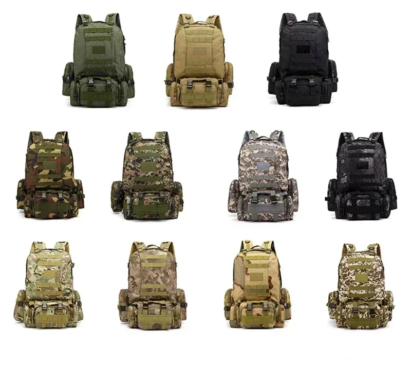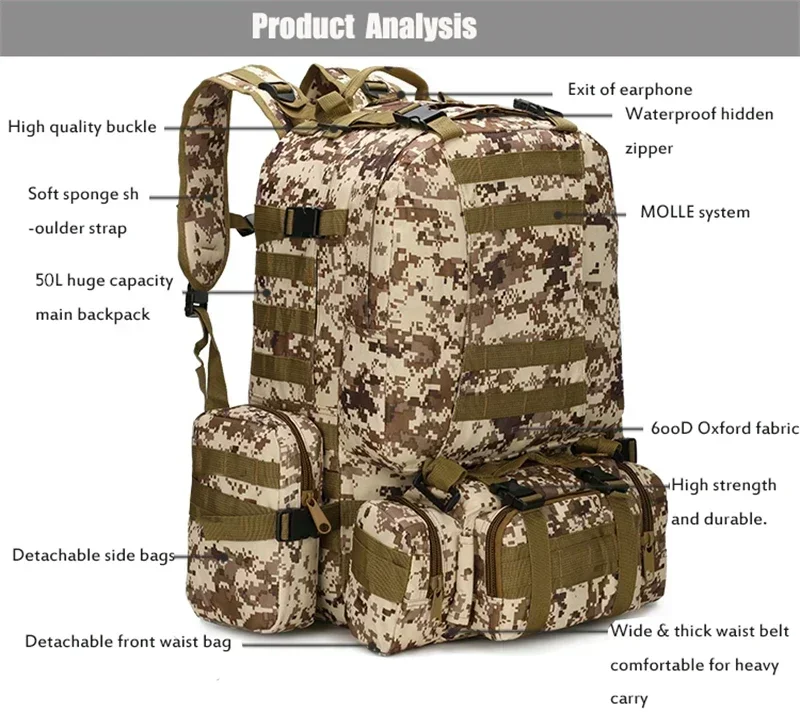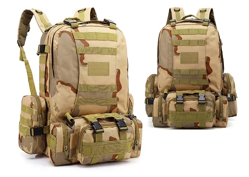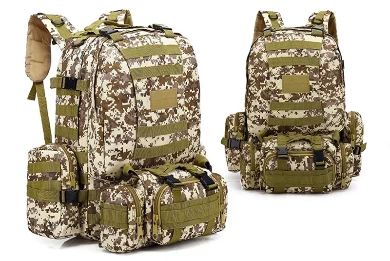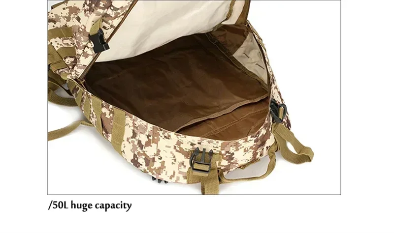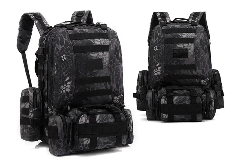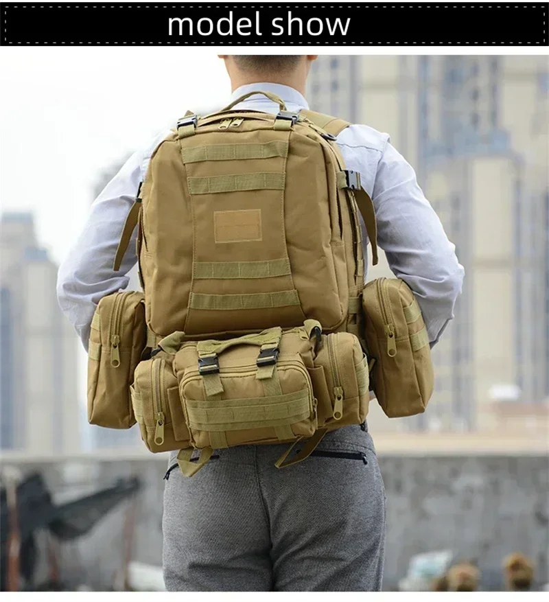 - Capacidad 55L + Molle, adecuada para deportes al aire libre como camping, senderismo, trekking, etc.