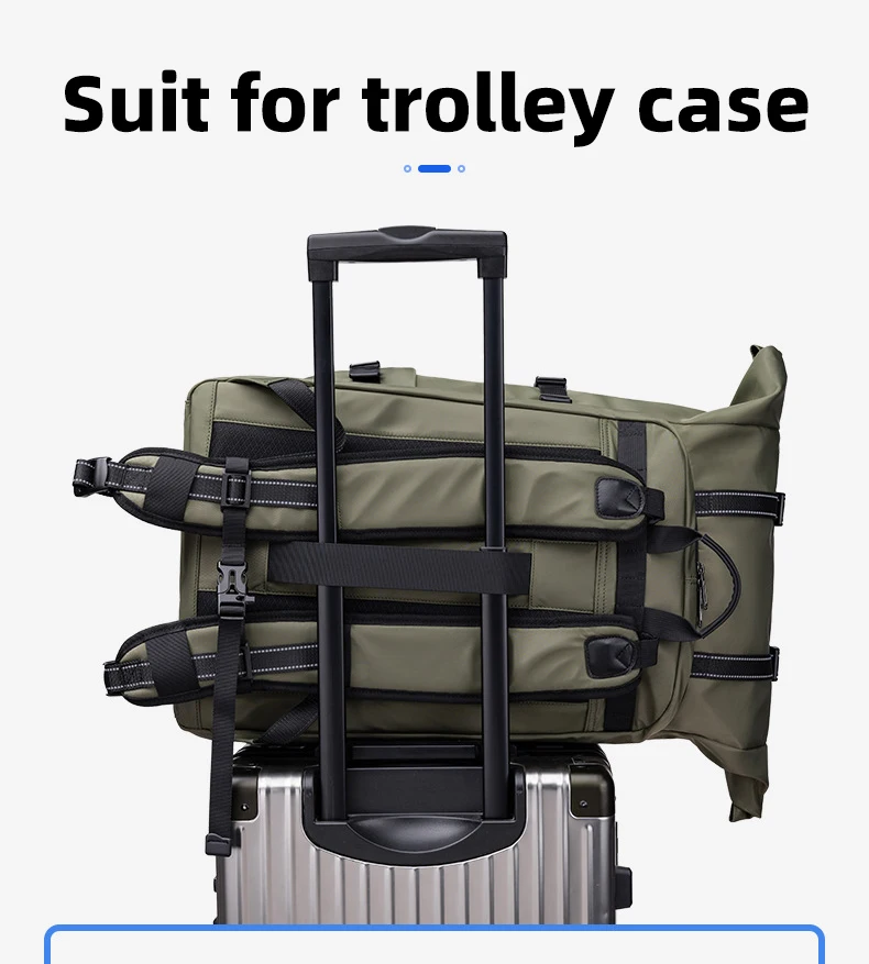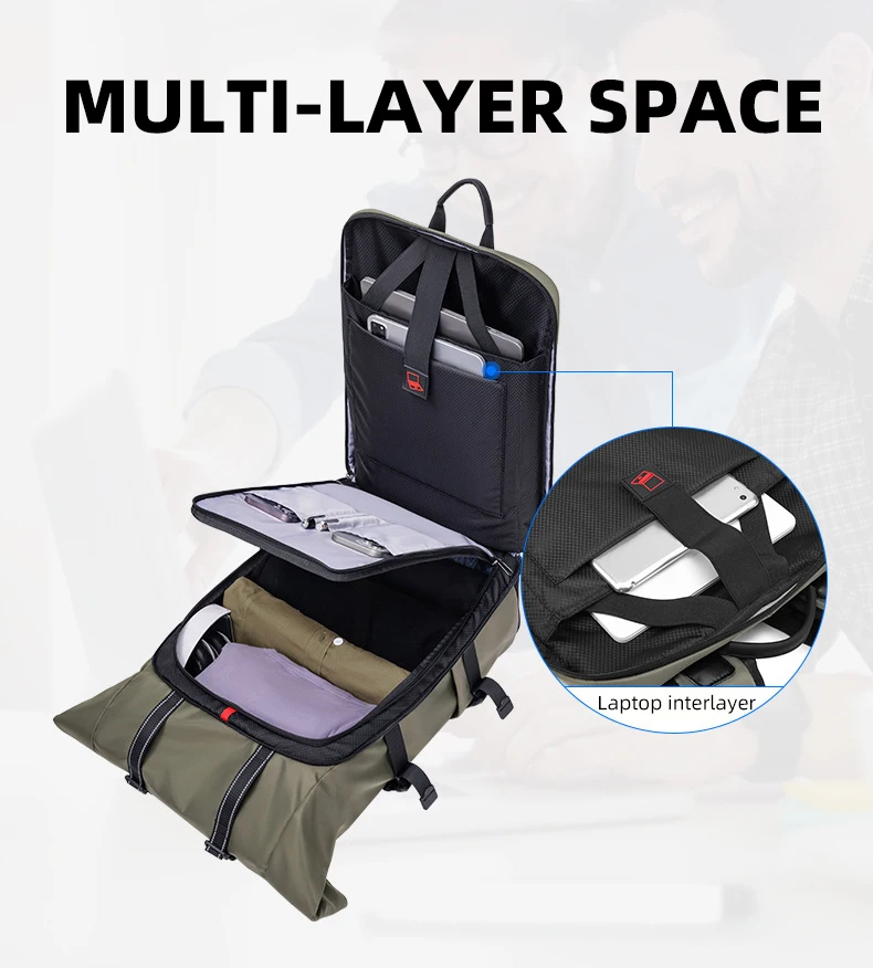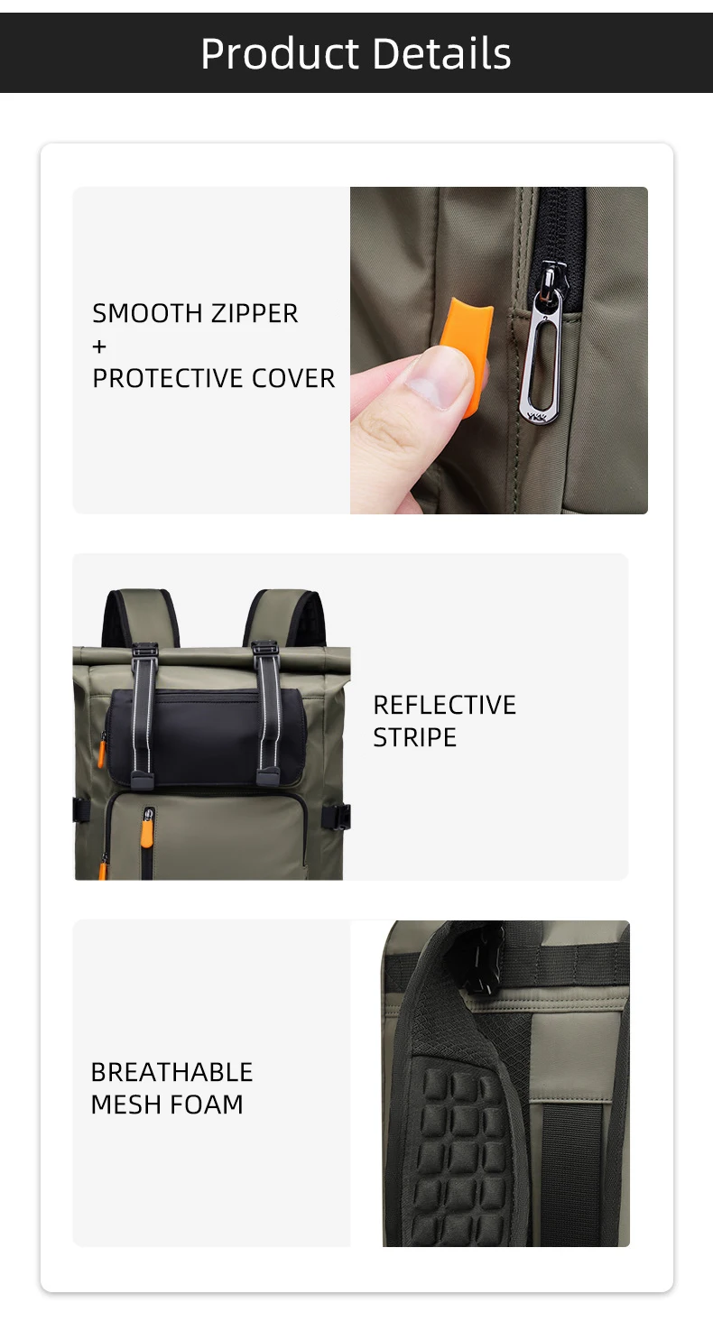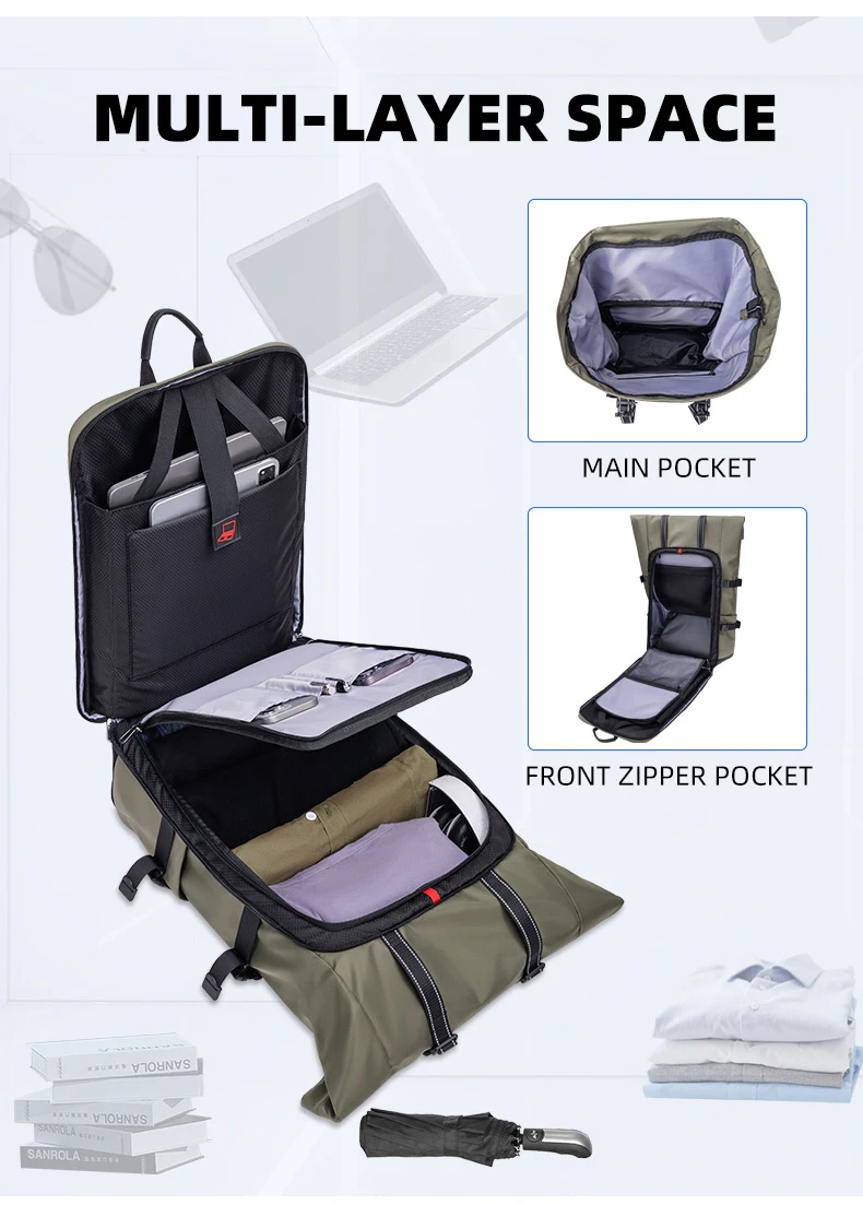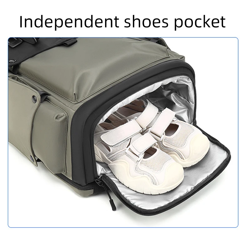 4.Estructura: compartimento independiente para computadora, bolsa de almacenamiento frontal, compartimento inferior para zapatos, bolsa de separación húmeda y seca, bolsa de almacenamiento lateral