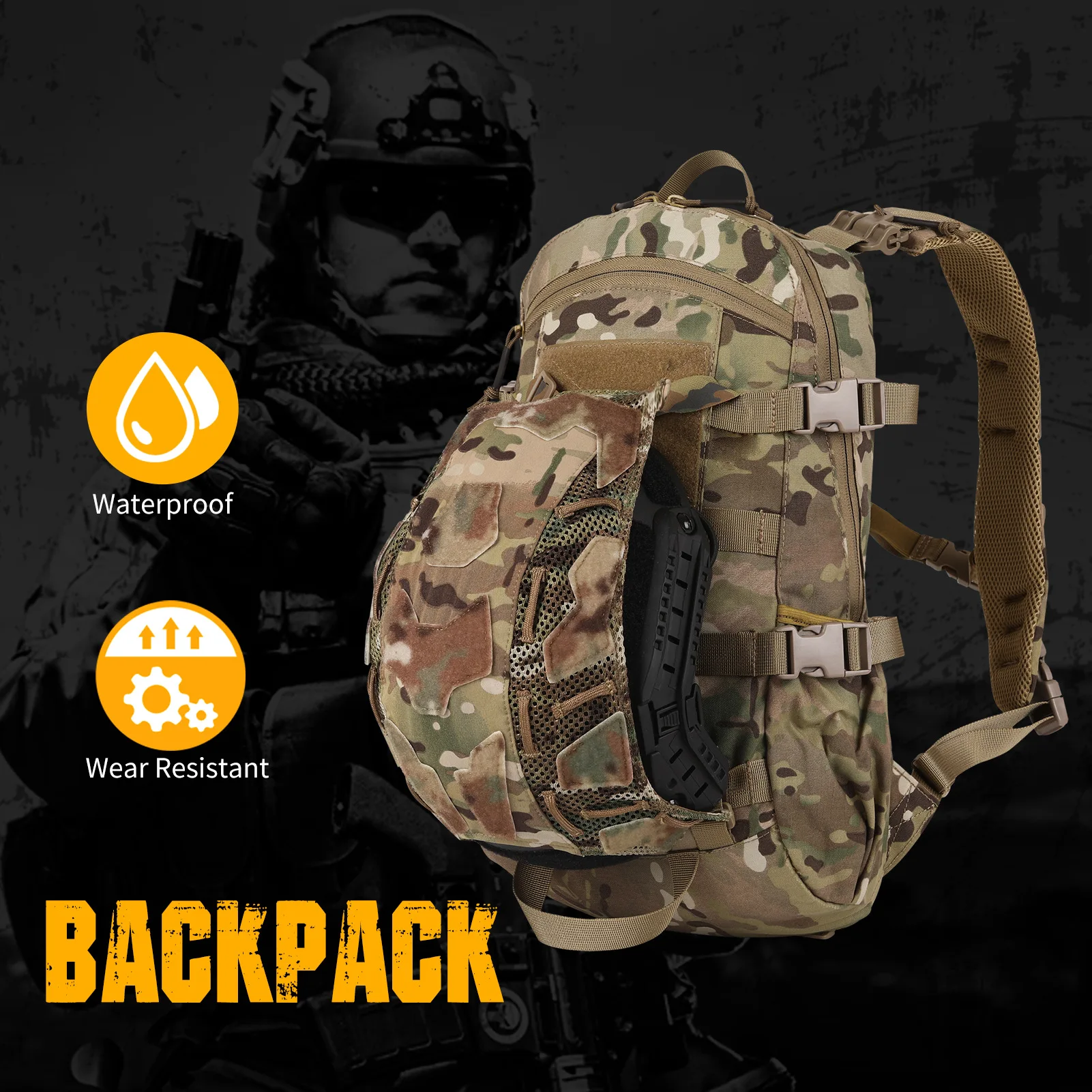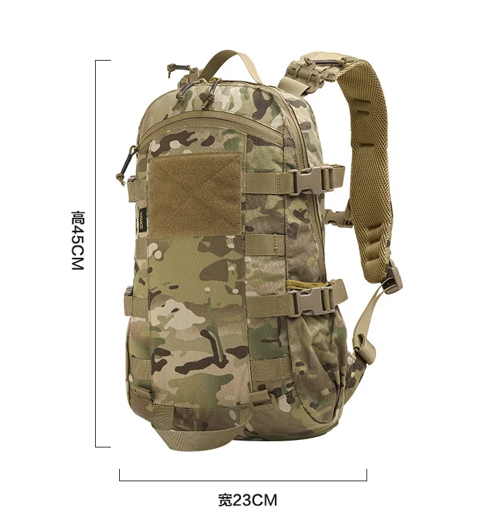 Dimensiones del producto: Alto 45 cm * Ancho 23 cm * Espesor 12 cm (puede acomodar una computadora de 15 pulgadas),Tamaño del bucle del gancho del bolsillo delantero 13,5X10cmCapacidad: Aproximadamente 12LPeso: 0,6 KGMaterial: nailon 500DIntroducción del producto:1.Material de nailon ultraligero 500D, alta densidad y peso ligero, impermeable, resistente al desgaste y a los arañazos, diseño impermeable, sin miedo a salpicaduras de agua, proporcionando suficiente protección para artículos asegurados.2.Diseño de mochila transpirable, malla de panal de gran superficie, que brinda soporte y ventilación para la espalda, despídase de la congestión y el calor que brindan las mochilas.3.El diseño portátil de nailon permite una recuperación fácil y rápida tanto hacia arriba como hacia abajo,4.Diseño de gancho de área grande en el bolsillo frontal, capaz de adjuntar información de identificación personal5.Compartimento principal de gran capacidad, compartimento interior para computadora, puede acomodar computadoras de 15 pulgadas, bolsa interior con cremallera de malla, puede encontrar rápidamente los artículos dentro de la bolsa, compartimento frontal curvo con cremallera frontal, conveniente para recuperar artículos,6.Hebilla de correa para el hombro desmontable, resistente y rápida, la correa se puede quitar rápidamente tanto hacia arriba como hacia abajo, con múltiples métodos de transporte, se puede llevar en la mano, en ambos hombros, en un hombro y en el pecho.7.Correas de hombro gruesas para un transporte cómodo sin dejar marcas, con una hebilla adicional en forma de D para sujetar artículos pequeños y una hebilla en el pecho para asegurar las correas de los hombros para evitar que se caigan.Agregue una ventana con cremallera de 5 cm en el costado de la mochila, que puede pasar a través de cables de auriculares, pajitas para bolsas de agua, etc., lo que la hace conveniente para uso en exteriores.8.Banda de presión de contracción de carga ajustable en el lateral, ajustable según el grosor de la mochila, para fijar los objetos dentro de la bolsa.9. Correas MOLLE de alta resistencia en el lateral, se pueden usar para montar una bolsa secundaria o herramienta, sistema MOLLE externo desmontable, se puede usar para montar una bolsa secundaria externamente, se puede usar para montar un casco o una pieza internamente y se puede montar para expansión
