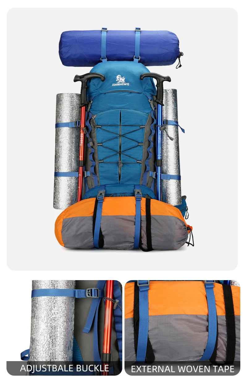 3.Sistema de suspensión externo multifuncional, correa múltiple inferior lateral, se puede fijar en tiendas de campaña, bastones de senderismo, almohadillas a prueba de humedad, etc.