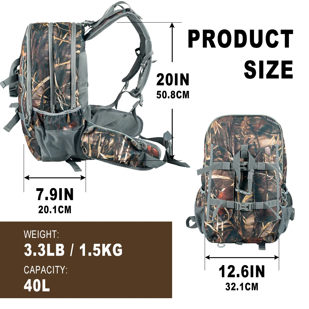 Con una capacidad de 40 litros, más grande que la mayoría de productos similares en el mercado, esta mochila cuenta con 3 compartimentos y más de 10 bolsillos funcionales.El tamaño de nuestra mochila de caza: 20”*12.61”*7.9”.Peso: 3,31 libras.