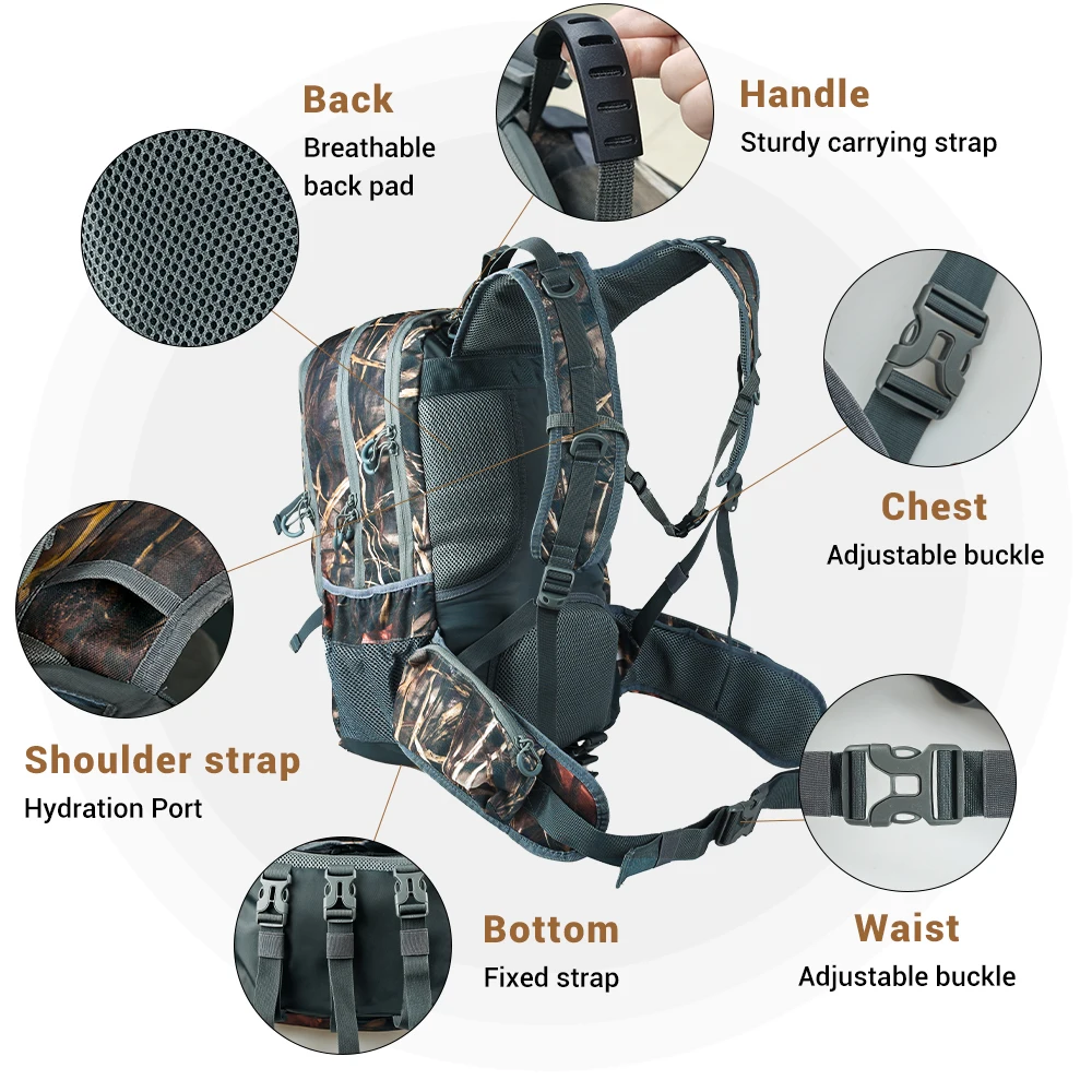 Nuestro producto utiliza materiales duraderos de alta calidad, presentando un diseño resistente que reduce el ruido al moverse por el bosque, lo que ayuda a evitar la detección por presa.Las excelentes costuras de la mochila garantizan que cada parte no se rompa fácilmente y las resistentes correas para los hombros pueden soportar un mayor peso y al mismo tiempo proporcionan resistencia a la perforación.