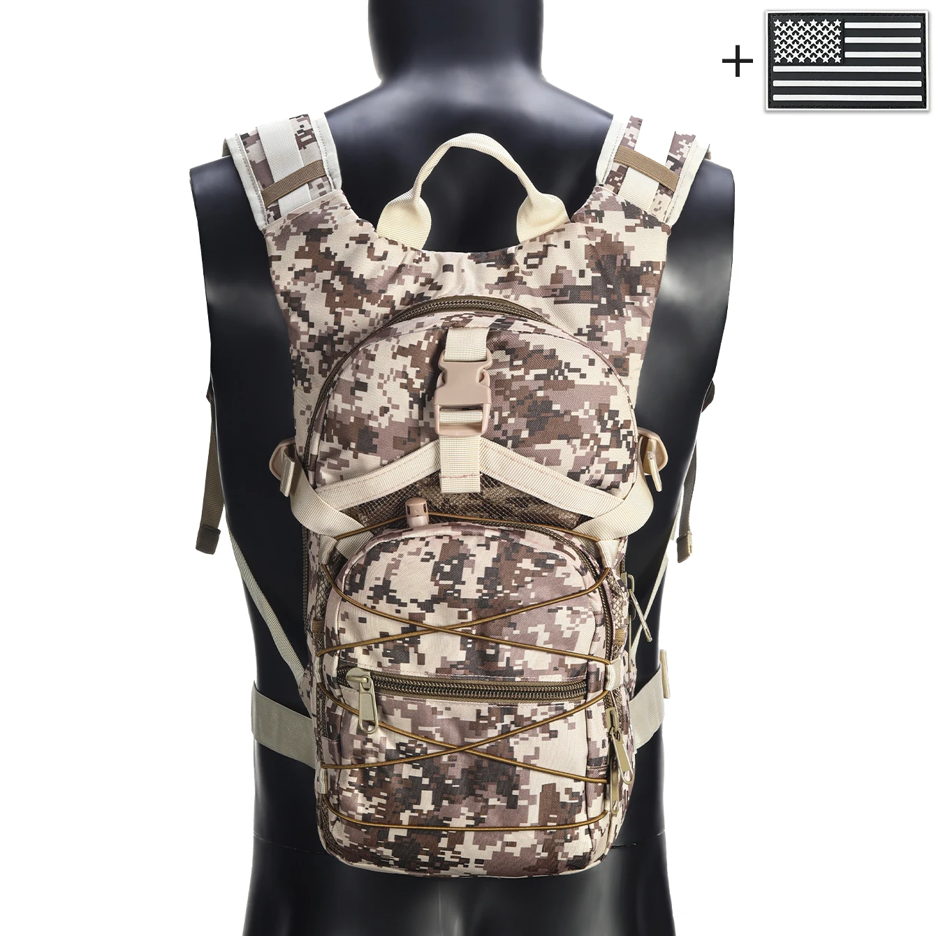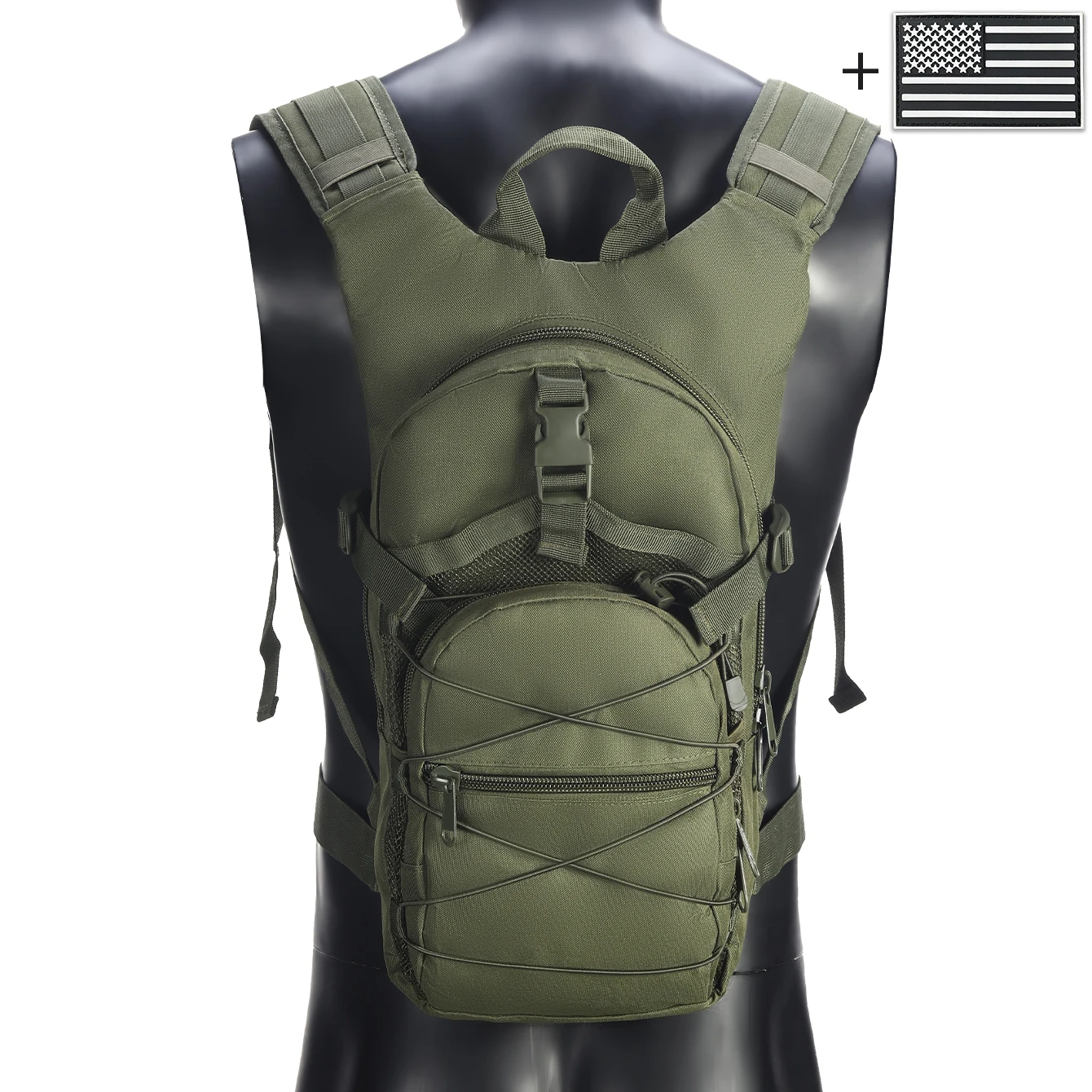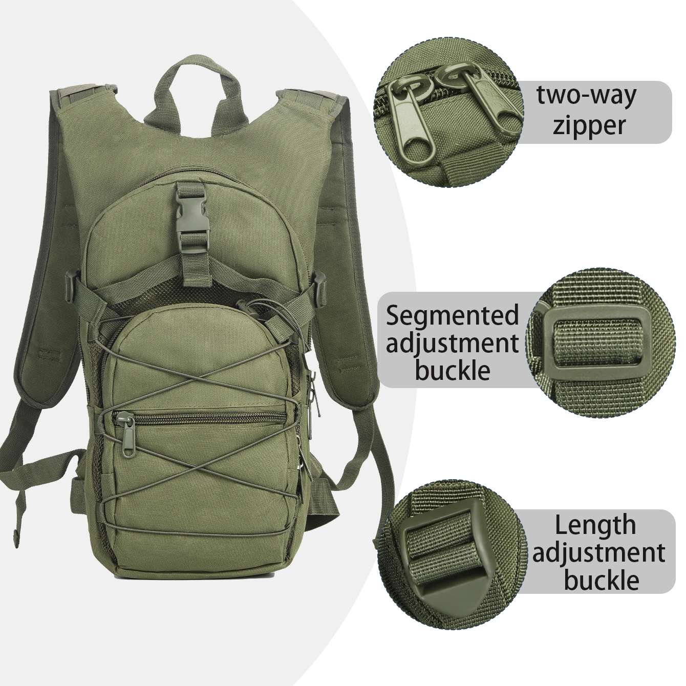 Mochila con correas elásticas y hebillas, bolsillos multicapa confeccionados en materiales duraderos adecuados para ambientes exteriores.
