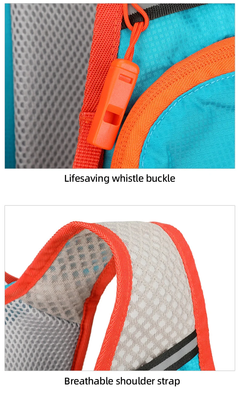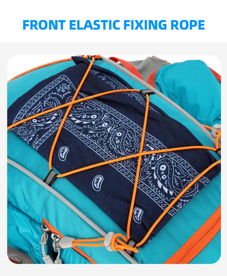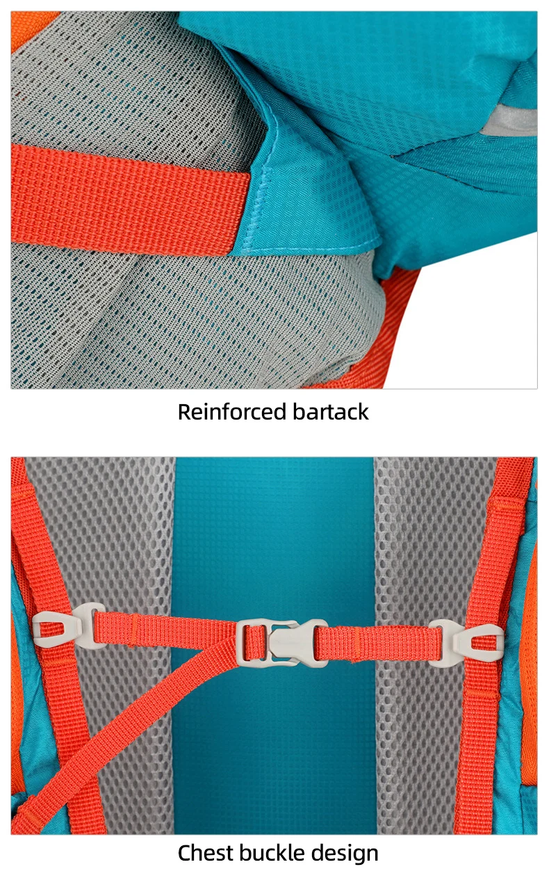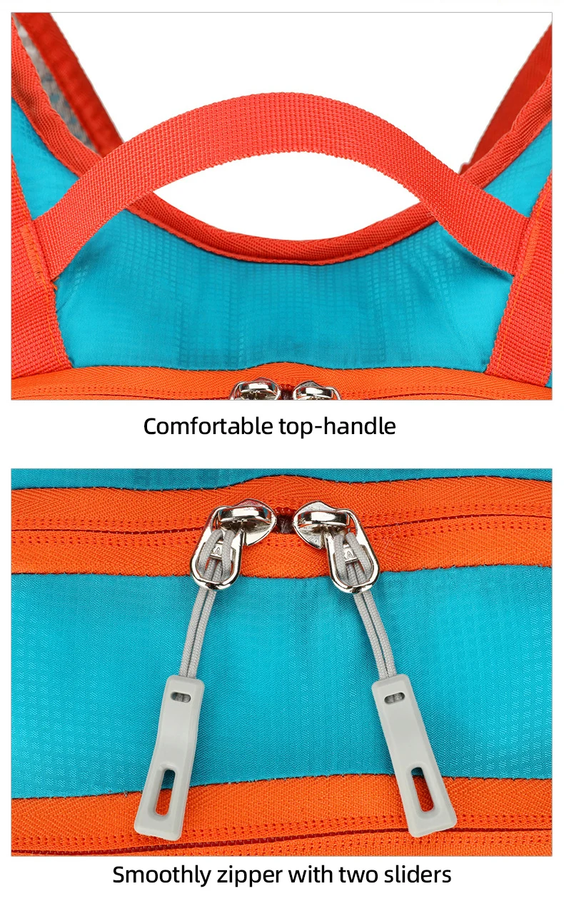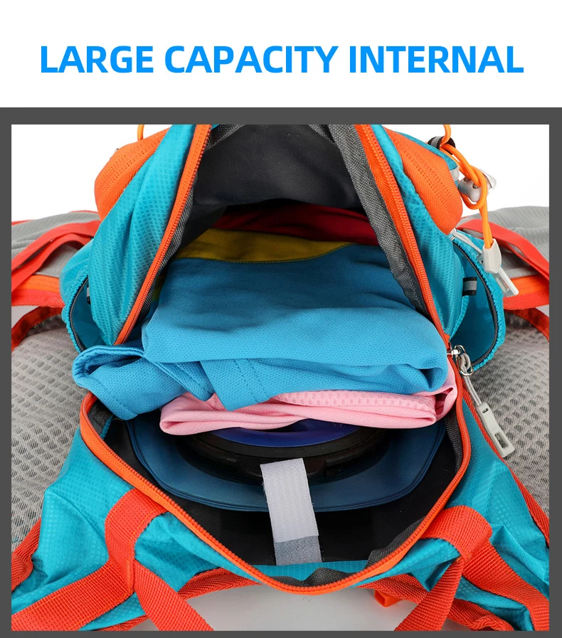 1.Gran capacidad: compartimento interno para bolsa de agua, cierre de velcro; pico superior, correa de montaje en el pecho