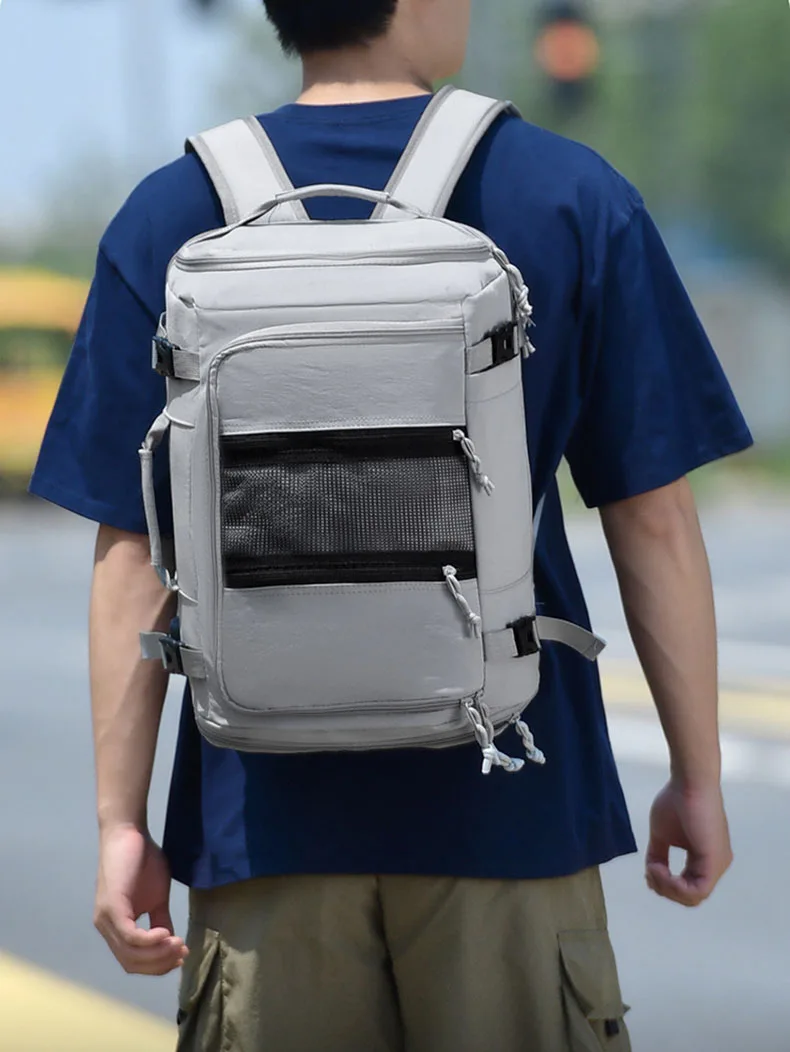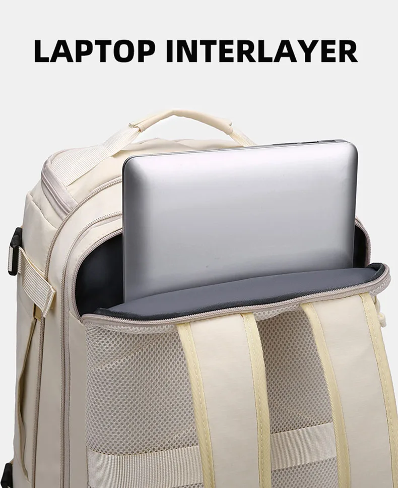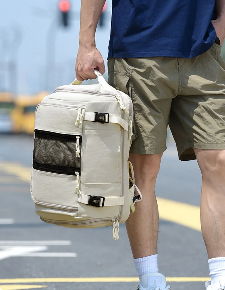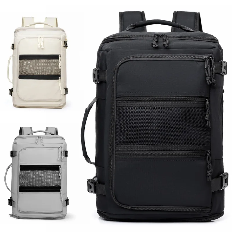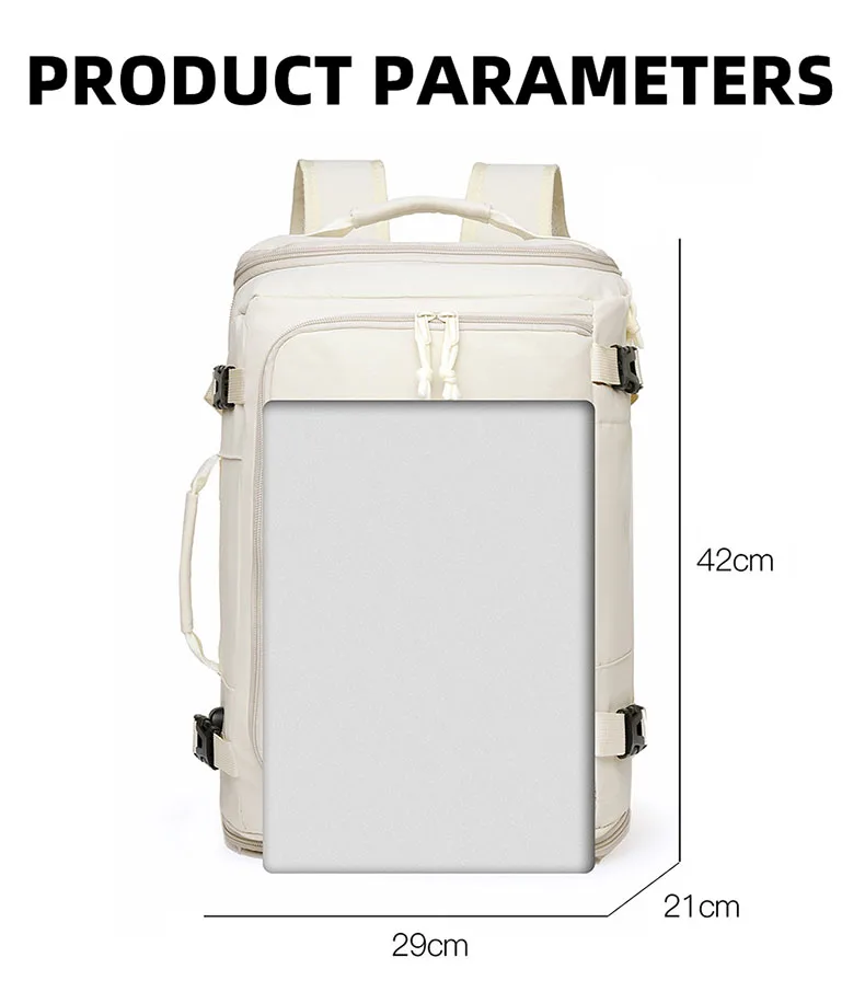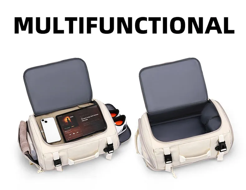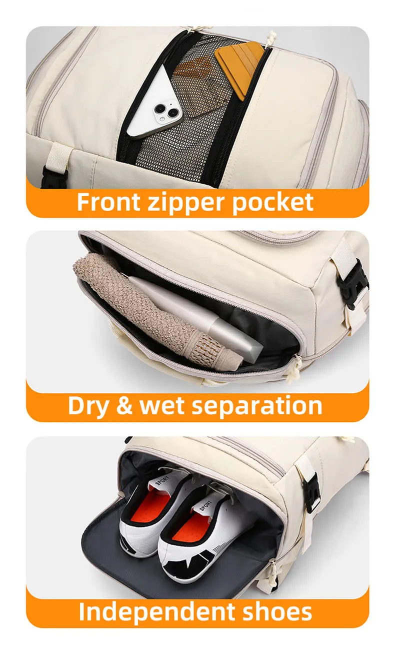 1.Bolsillo principal de gran capacidad, la boca de la bolsa se puede abrir 180°, bolsillo de malla con cremallera incorporado, el cuerpo de la bolsa configura bolsillos secundarios con cremallera, con compartimento separado para zapatos y compartimento para computadora.Fácil acceso y almacenamiento.
