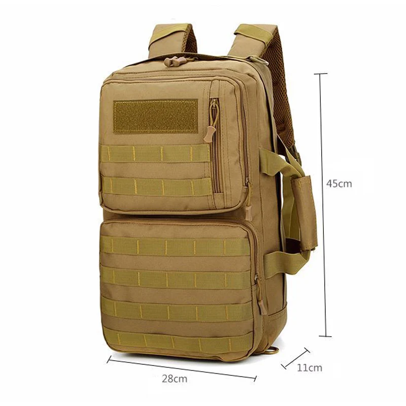 Tamaño: 45cm * 28cm * 11cmCapacidad: Aproximadamente ~ 40 LMaterial:Tela Oxford 900DPaquete incluido:1 * MochilaRegalo aleatorio, un parche de Velcro personalizado y una hebilla colgante para mochila.