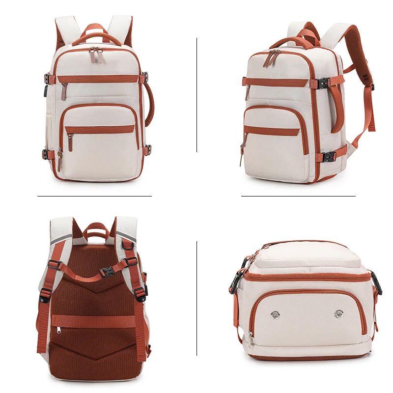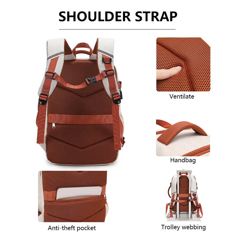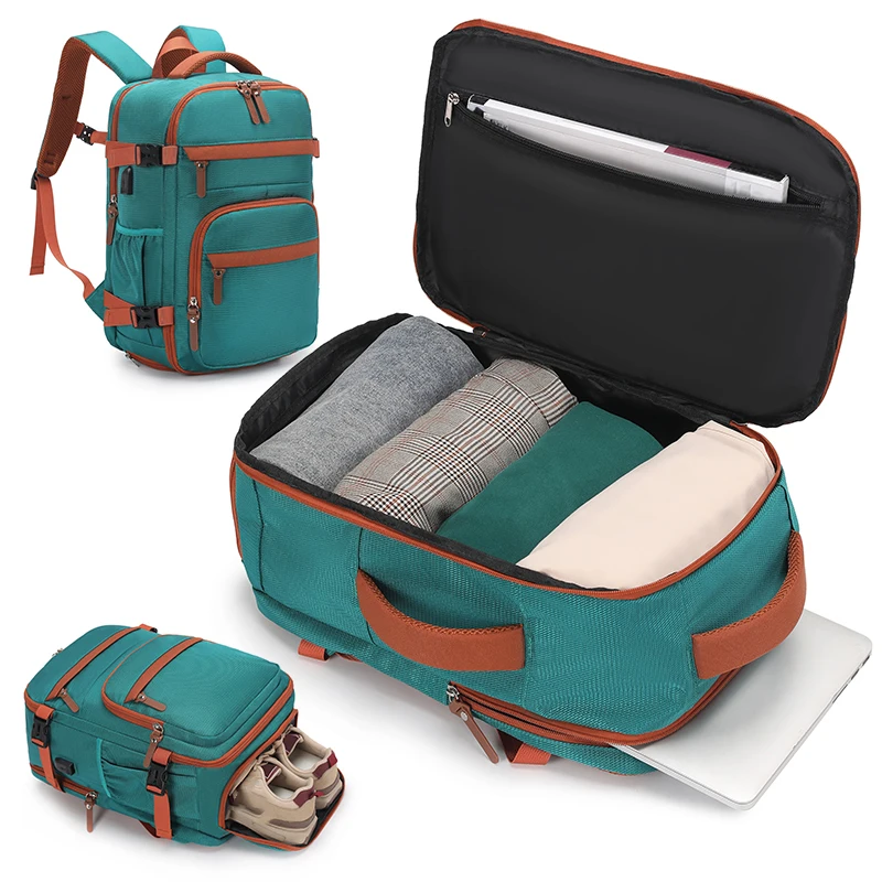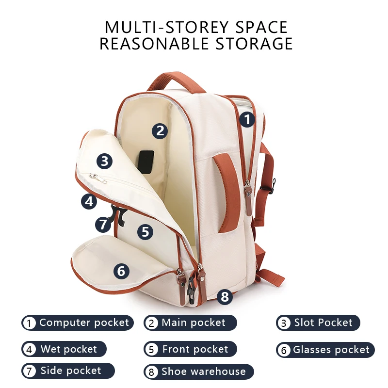 1.Bolsillo principal de gran capacidad, la boca de la bolsa se puede abrir 180°, bolsillo de malla con cremallera incorporado, el cuerpo de la bolsa configura bolsillos secundarios con cremallera, con compartimento separado para zapatos y compartimento para computadora.Fácil acceso y almacenamiento.