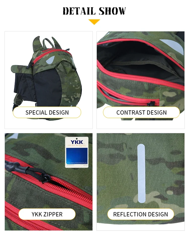 EmersongearS Junior Stylish Camo Backpack has a novel shape and lovely design. There are expression reflective stickers on the outside of the bag. It can ensure the safety of users when used at night; The small package also has a basic capacity of 6.8 liters, which is especially suitable for girls and children. The design inspiration comes from "little devil". The bag has two cute little wings and devil horns, together with expression reflective stickers in different colors, making the product more distinctive and attractive.