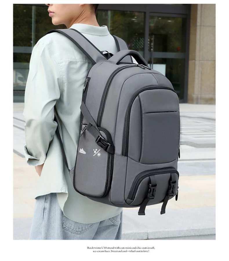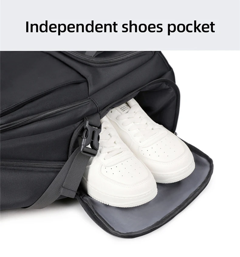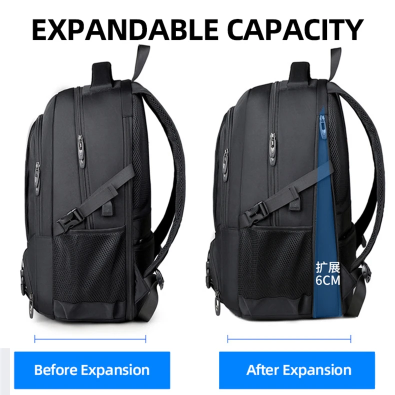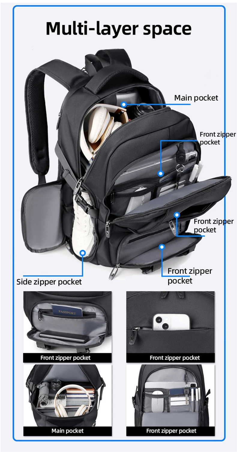 1.Juego de bolsa principal de gran capacidad, compartimento para computadora incorporado, diseño de bolsa con múltiples combinaciones, el cuerpo de la bolsa se puede expandir en la mochila, apertura con cremallera de expansión trasera, el cuerpo de la bolsa se puede ampliar 6 cm, con un compartimento para zapatos independiente, almacenamiento de viaje más conveniente.