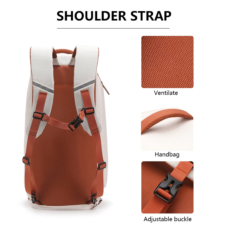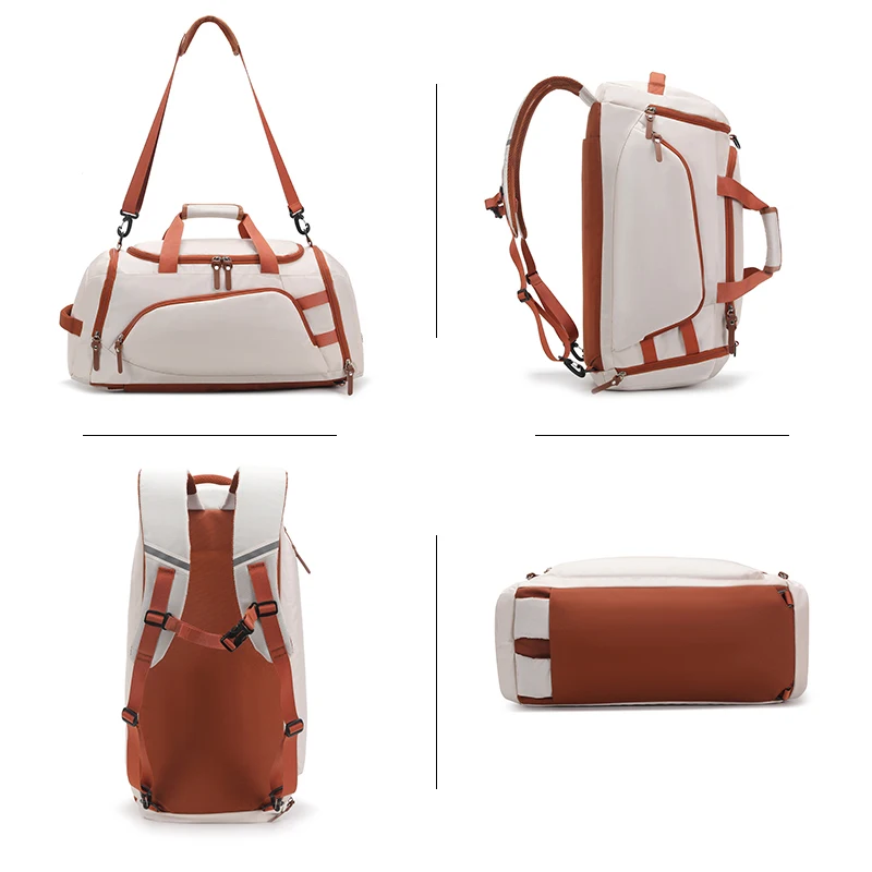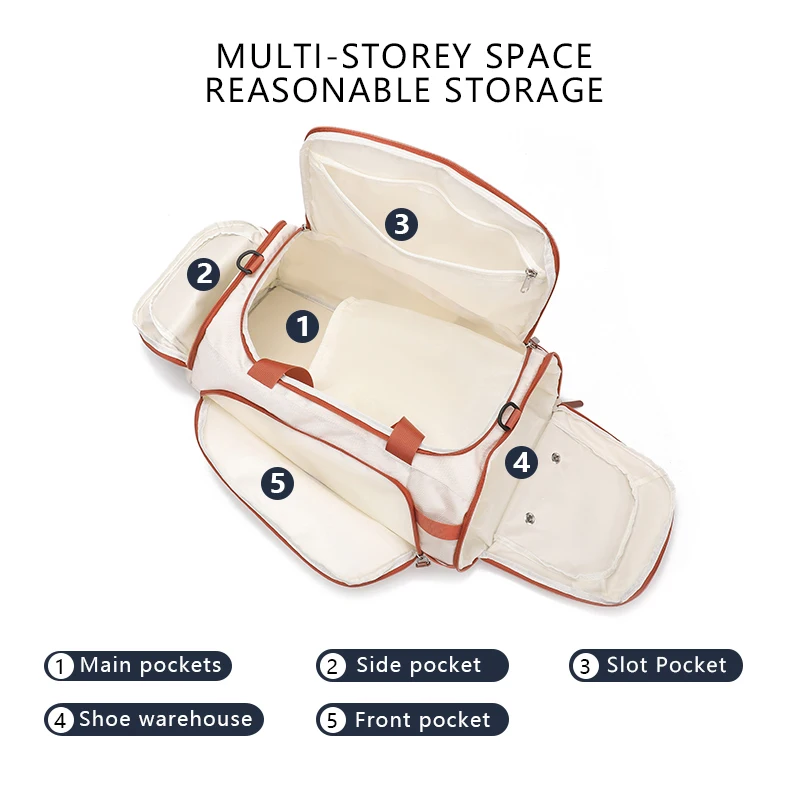 1.Bolsillo principal de gran capacidad, la boca de la bolsa se puede abrir 180°, bolsillo de malla con cremallera incorporado, el cuerpo de la bolsa configura bolsillos secundarios con cremallera, con compartimento separado para zapatos y compartimento para computadora.Fácil acceso y almacenamiento.