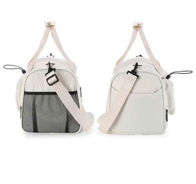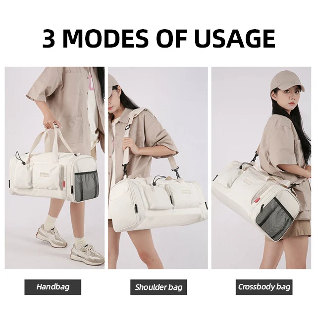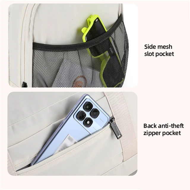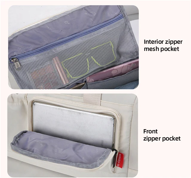 1. Bolsillo frontal con cremallera y bolsillo con cordón.gran bolsillo principal.Bolsillos laterales con ranura y bolsillo lateral para zapatos, bolsillo lateral independiente en seco y húmedo, y bolsillo interior de malla superior para guardar cosas pequeñas.