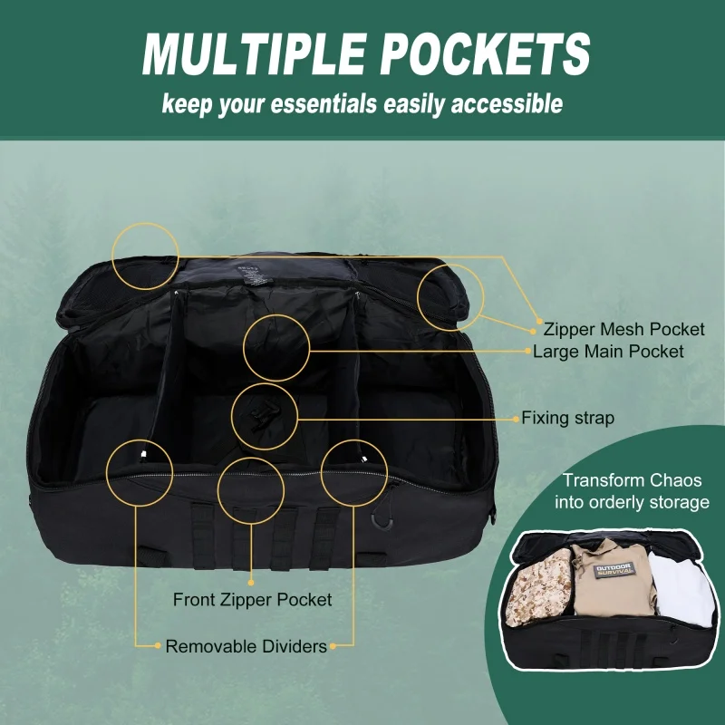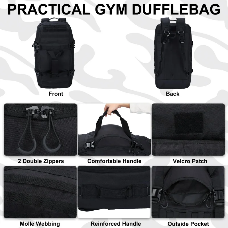 【Bolsa de gimnasio grande】La bolsa de gimnasia mide23" largo x 12" ancho x 10" alto pulgadas (58,42 x 30,48 x 25,4 cm)conCapacidad de 45L.1 compartimento principal grande con 2 divisores plegables y 1 correa ajustable para mayor seguridad del equipaje. 2 bolsillos laterales con cremallera y 2 pequeños bolsillos de malla. Dos correas de hombro ajustables y correa para el esternón que permiten llevar el bolso como mochila táctica.